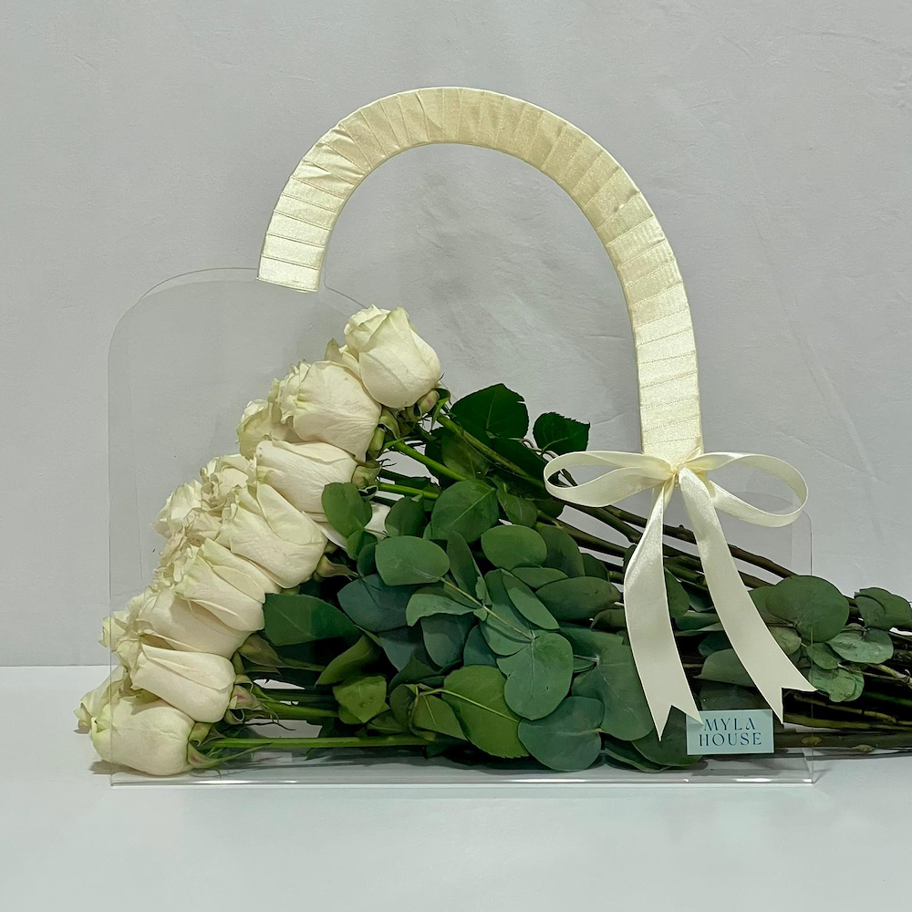 A stylish clear bag featuring carefully arranged white roses with a soft cream ribbon, radiating purity and refined simplicity.