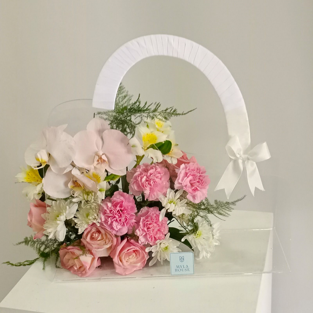 A clear bag filled with a delicate arrangement of pink and white roses, perfect for special gifts.