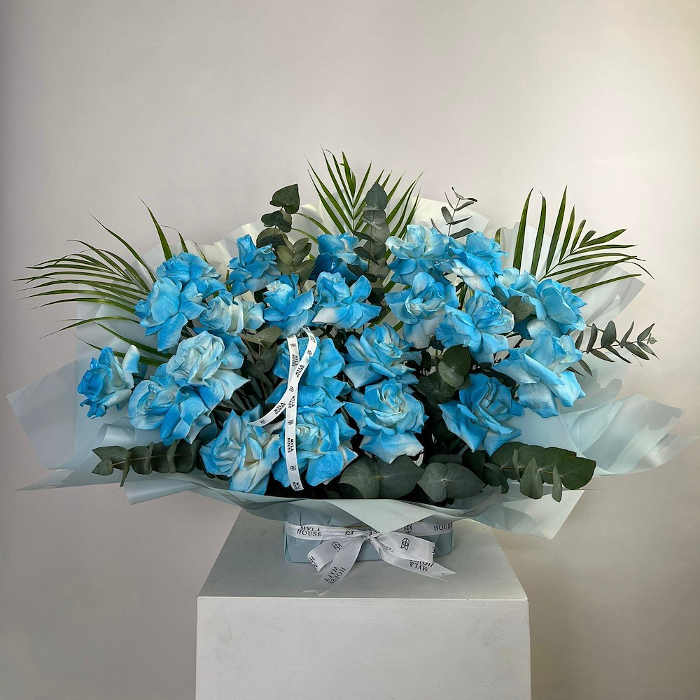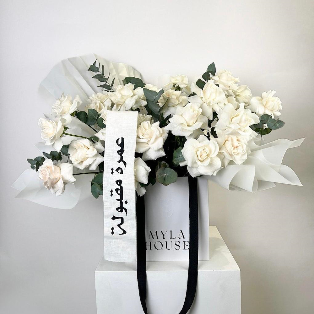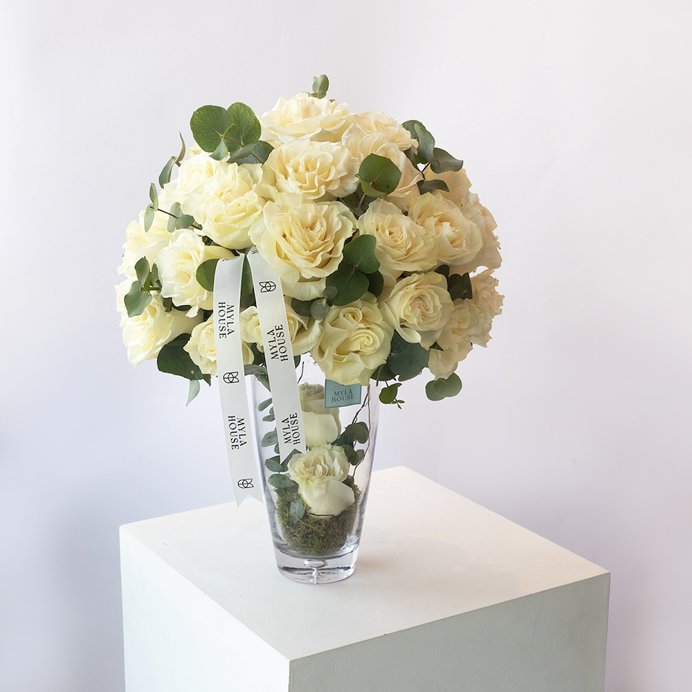 A soft bouquet featuring 14 white roses with delicate daisies.