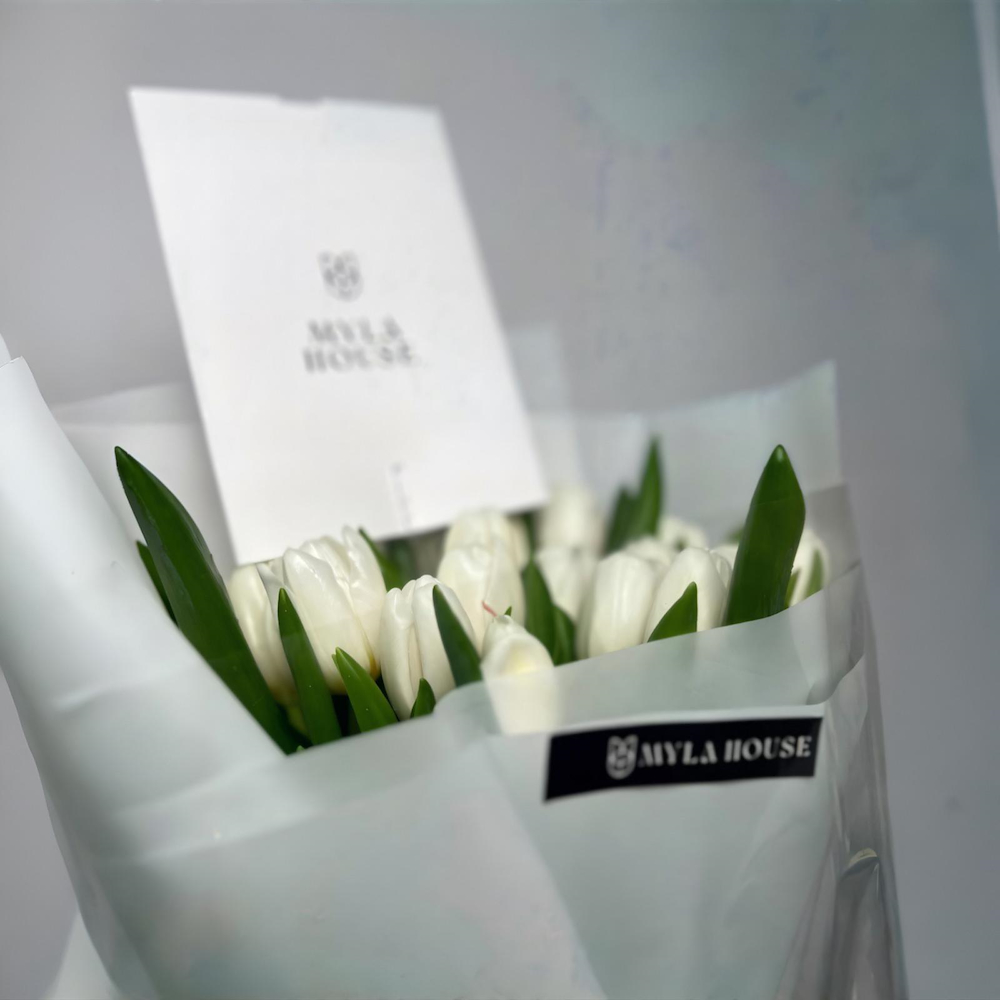An elegant bouquet of white tulips wrapped in luxurious white, symbolizing purity and serenity.