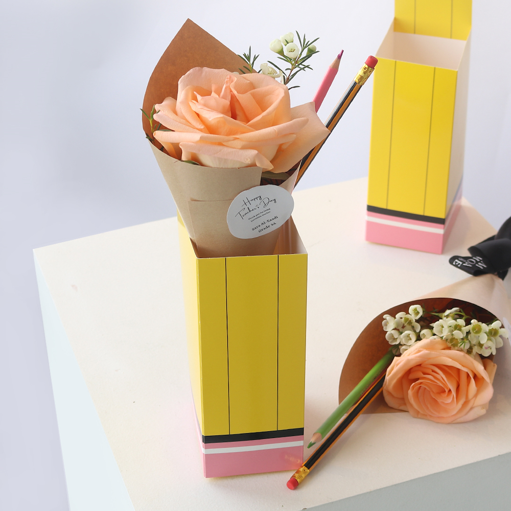 A 12-piece giveaway set in a yellow pencil-shaped holder, each piece features natural peach roses with colored pencil accents. Includes a clear acrylic base. An elegant, eye-catching touch.