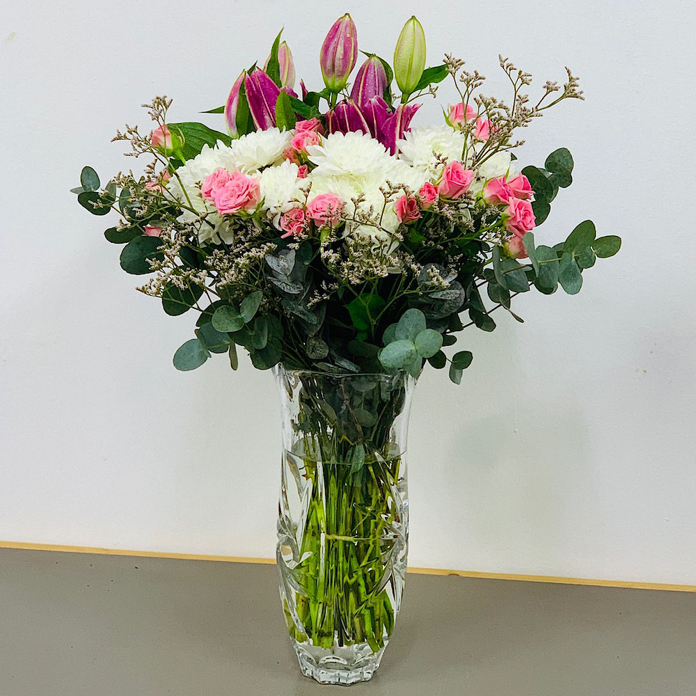 An elegant vase that contains lilies, chrysanthemums, baby roses with eucalyptus.