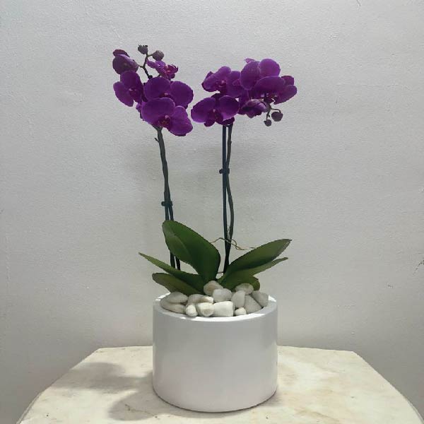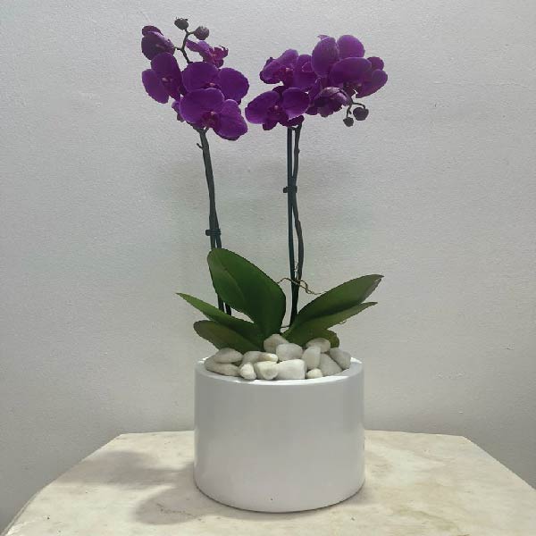 Purple Phalaenopsis arranged in white GRC pot with pebbles.