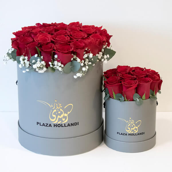 Two Plaza Hollandi hat boxes filled with red roses. One medium Plaza Hollandi hat box filled with red roses and gypsophila and a small Plaza Hollandi signature hat box filled with red roses. A wonderful original gift to send to your Valentine this year.