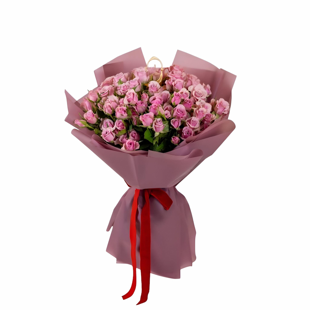 A hand bouquet containing purple baby roses, arranged beautifully.