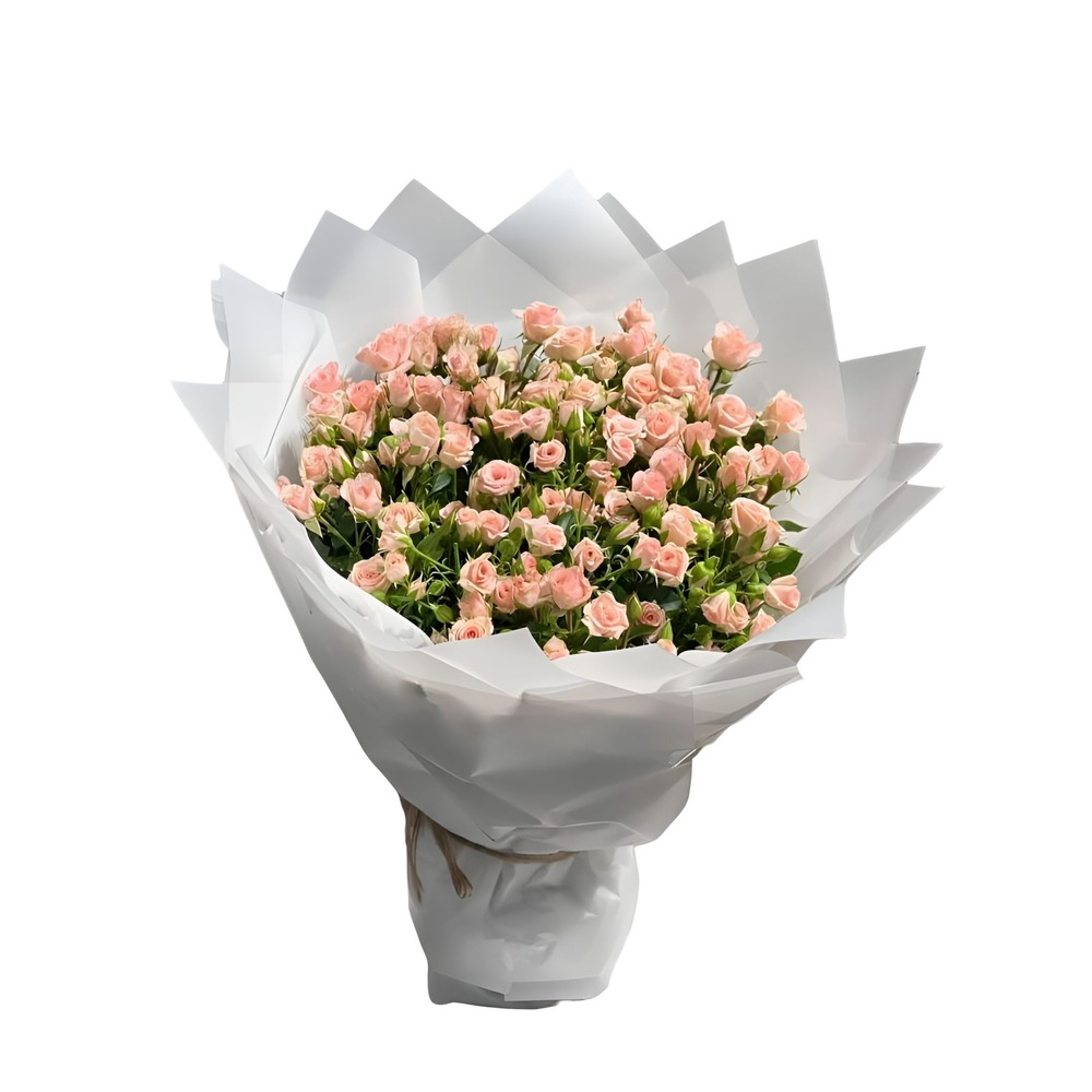 A hand bouquet containing pink baby roses, wrapped beautifully in white wrapping paper.