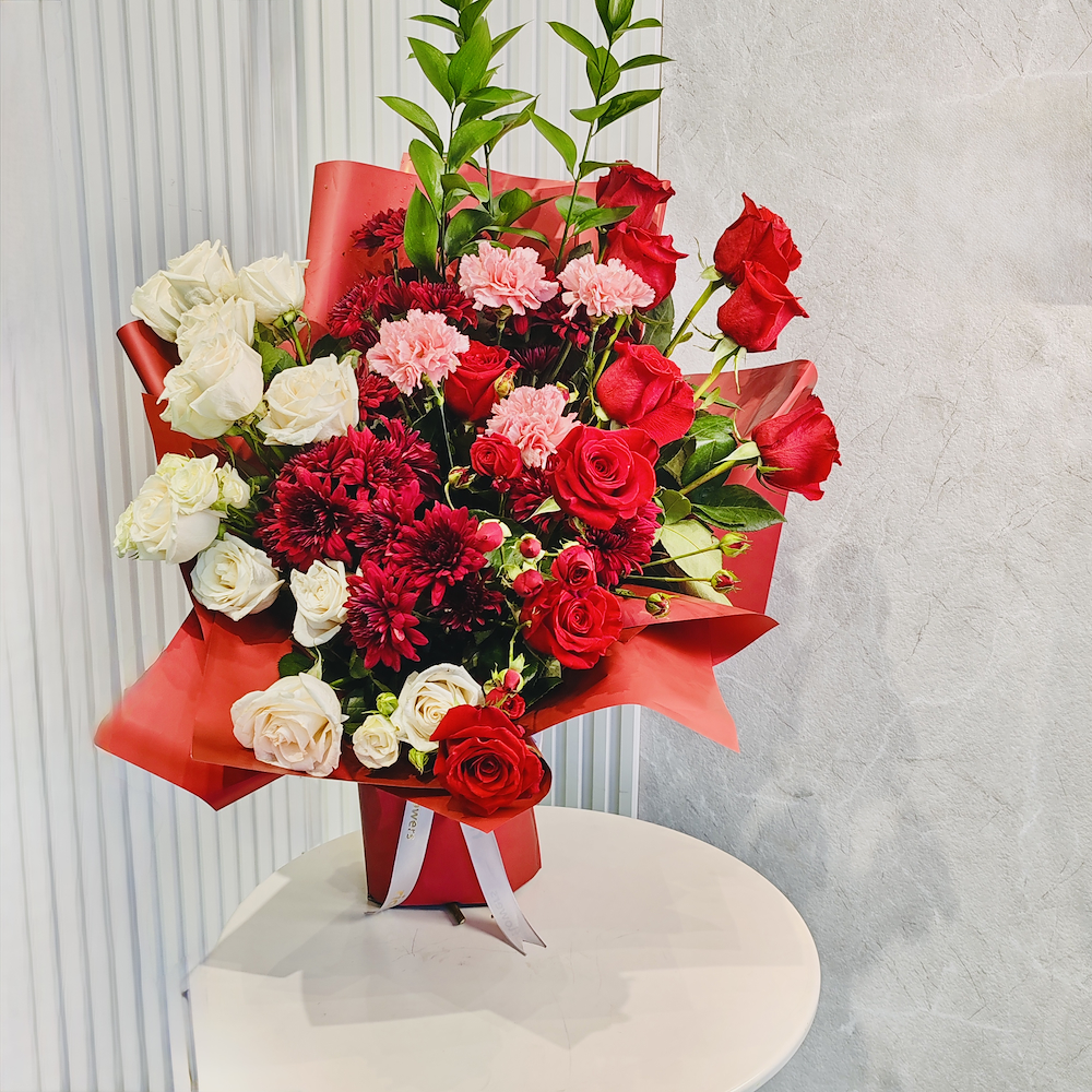 A hand bouquet featuring baby roses with a special wrapping.