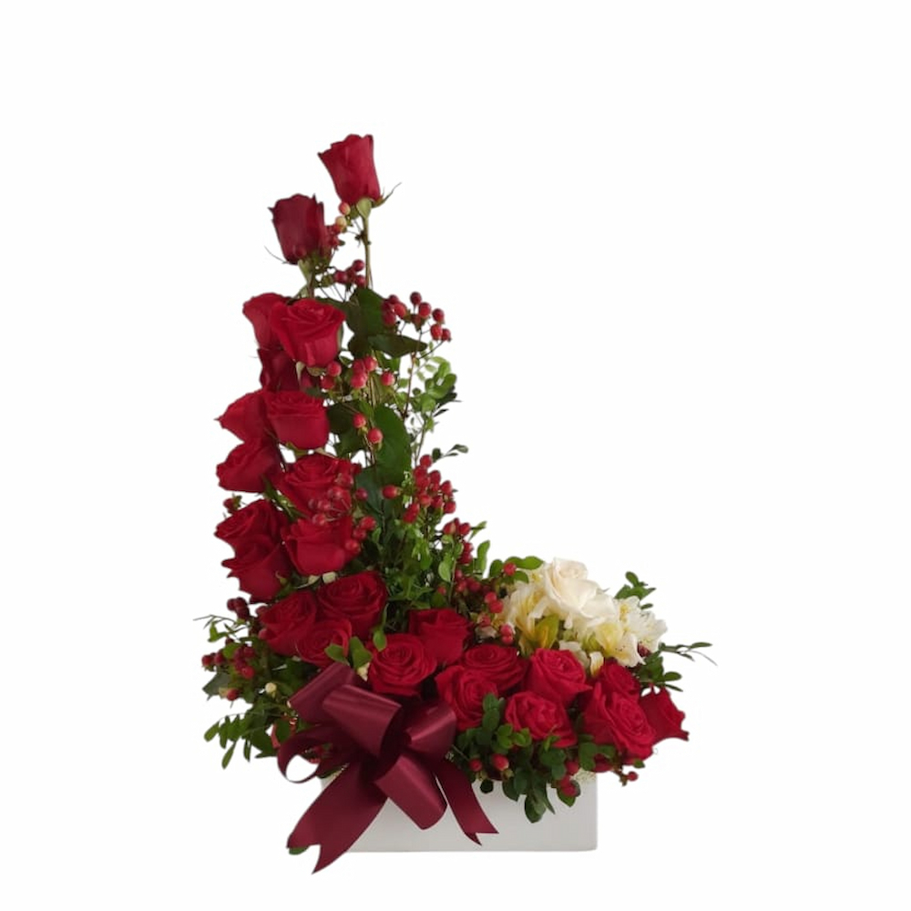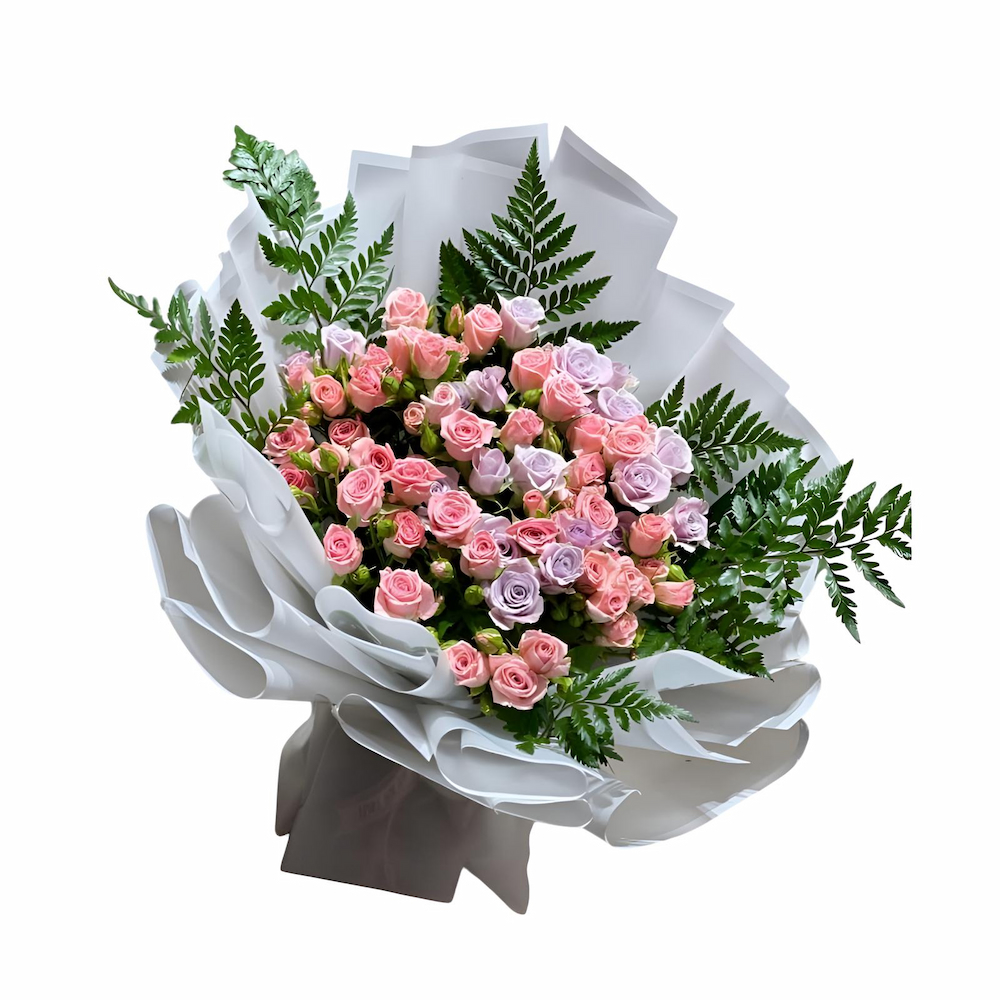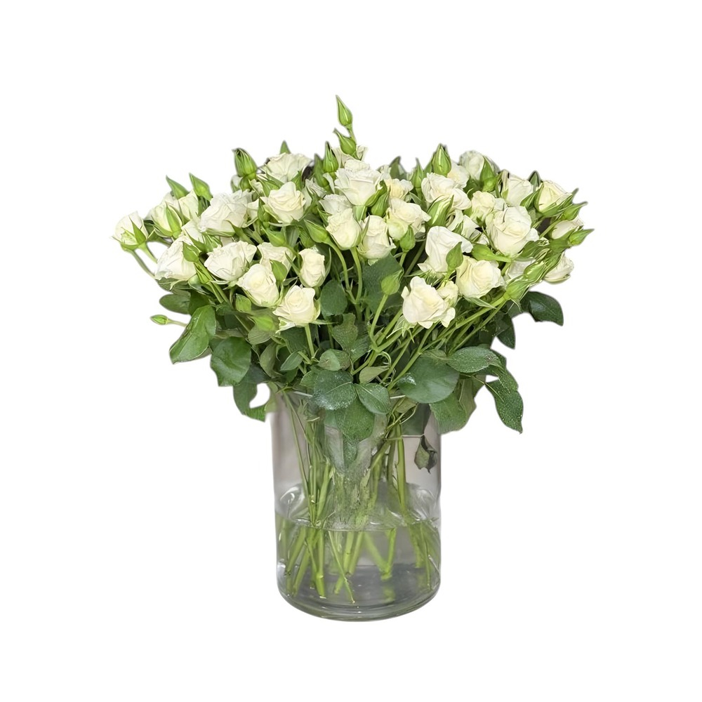 A bouquet containing white baby roses, arranged beautifully in a glass vase.