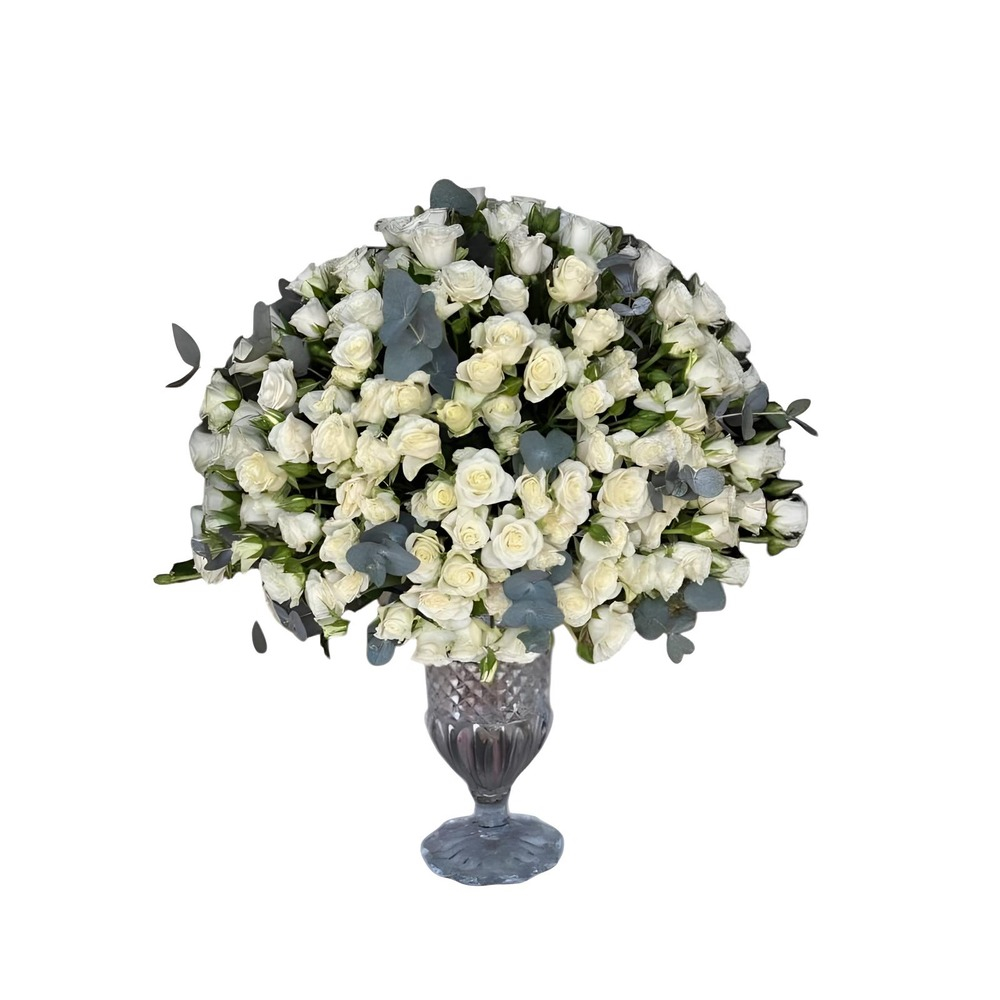 A bouquet containing white baby roses and eucalyptus leaves, arranged beautifully in a vase.