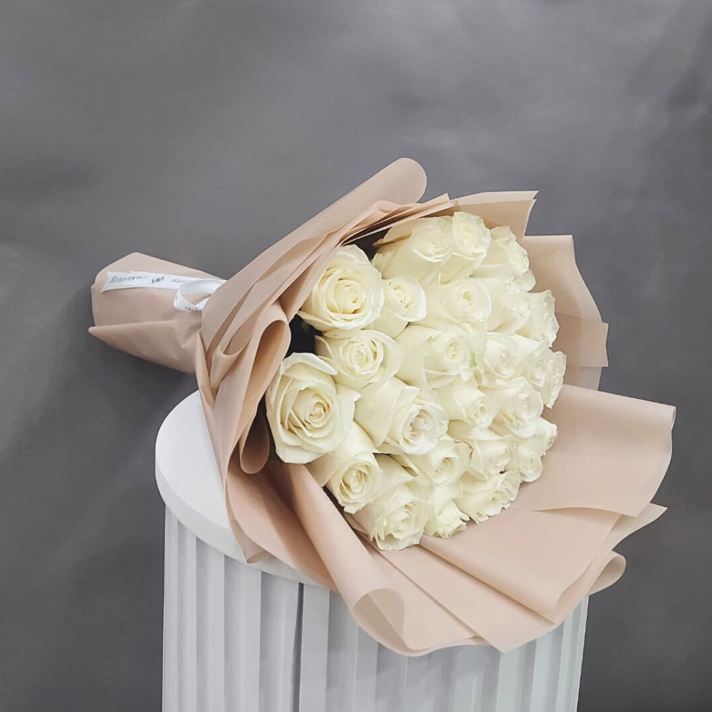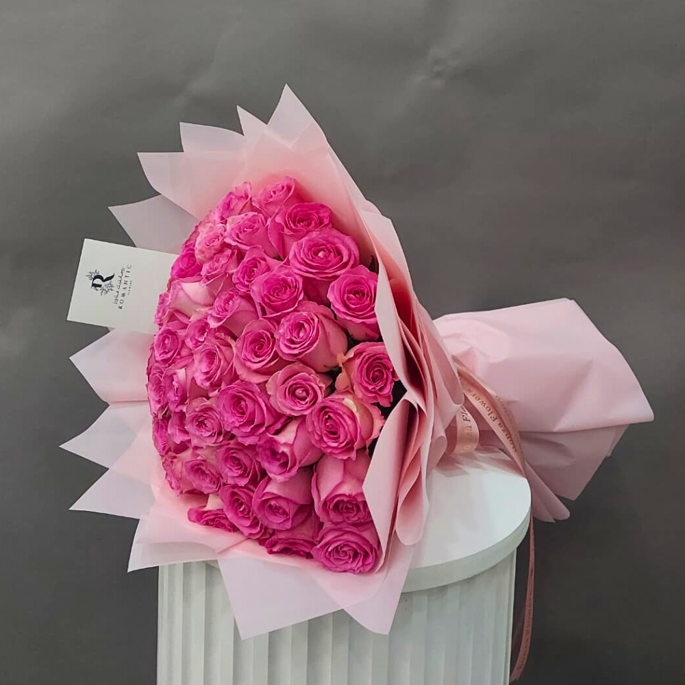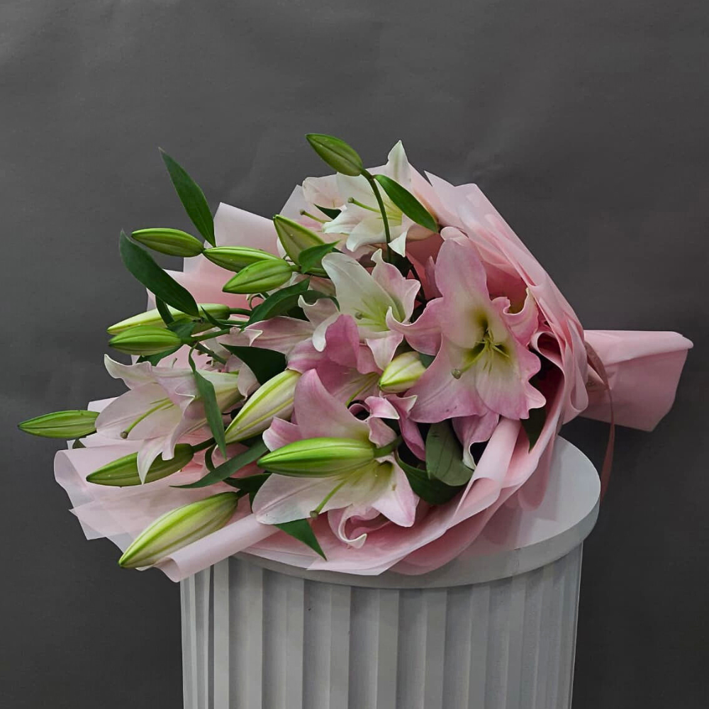 An elegant bouquet featuring soft pink lilies flowers, wrapped in delicate pink paper, offering a timeless expression of luxury and grace.