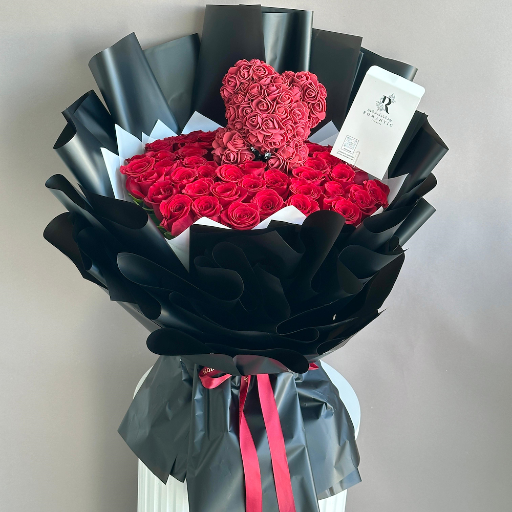 A stunning bouquet of premium red roses wrapped in luxurious black paper, featuring a handcrafted rose teddy heart at the center. This elegant arrangement symbolizes deep love and passion, making it a perfect gift for romantic occasions, anniversaries, and special celebrations.