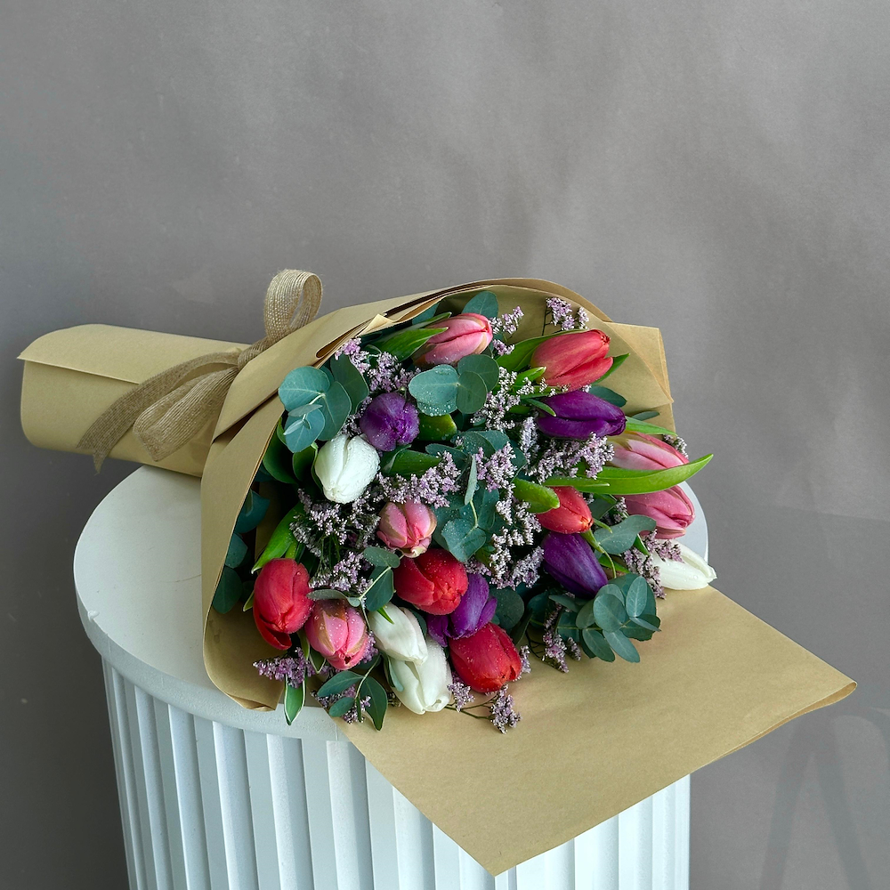 An elegant bouquet featuring tulips in beautiful shades with a special wrapping.