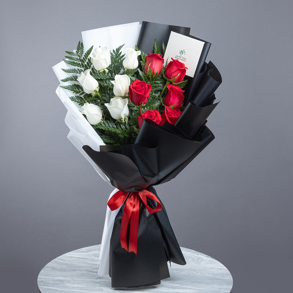 Beautiful Hand Bouquet Of Red Rose , White Rose And Leather Leaf In Black And White Wrapping Paper.