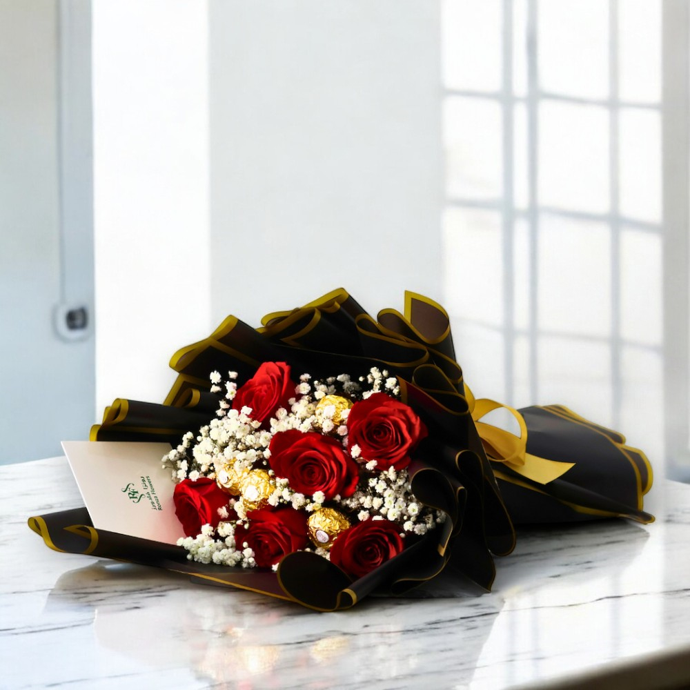 A beautiful bouquet filled with red roses and gypsophila flowers, with chocolate pieces.