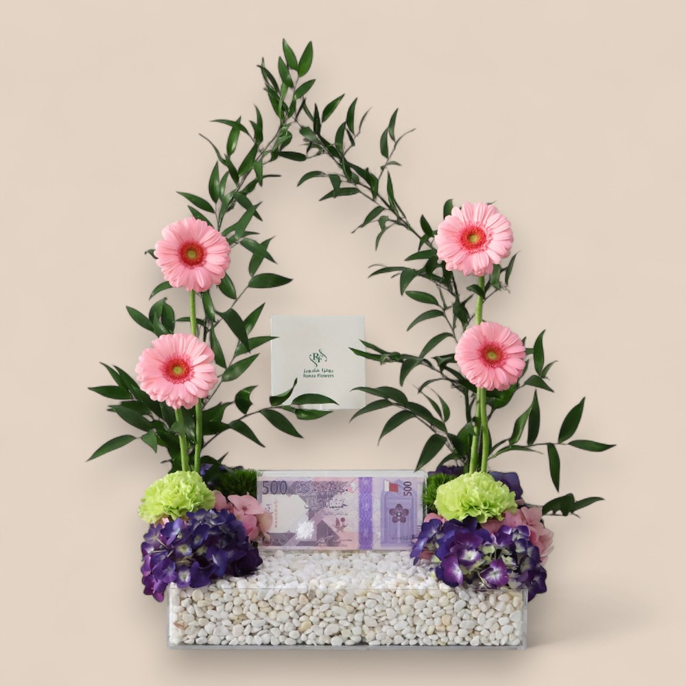An elegant tray filled with gerberas, hydrangeas and carnation flowers, with empty money pocket. Note: Money is not included.