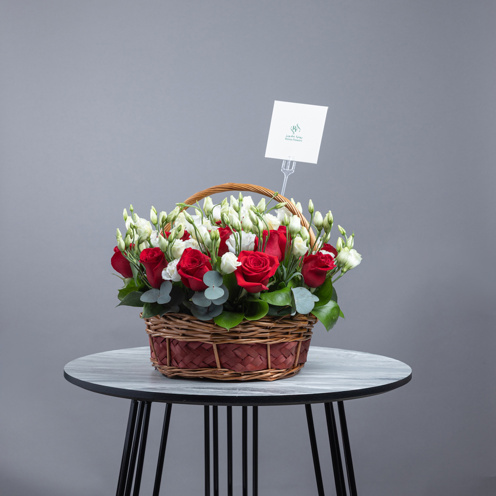 Beautiful Basket arrangements of red rose , white eustoma and green leaves.