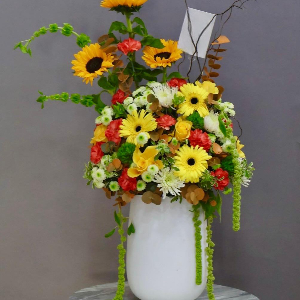 A caramic vase in luxury flowers includes .sunflowers, gerbera, roses, Amar thus chrysamthum and greens