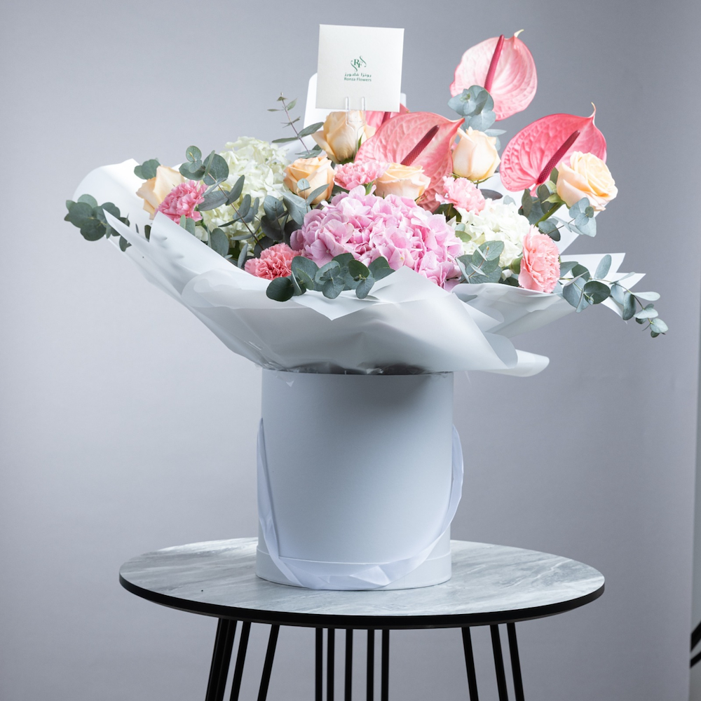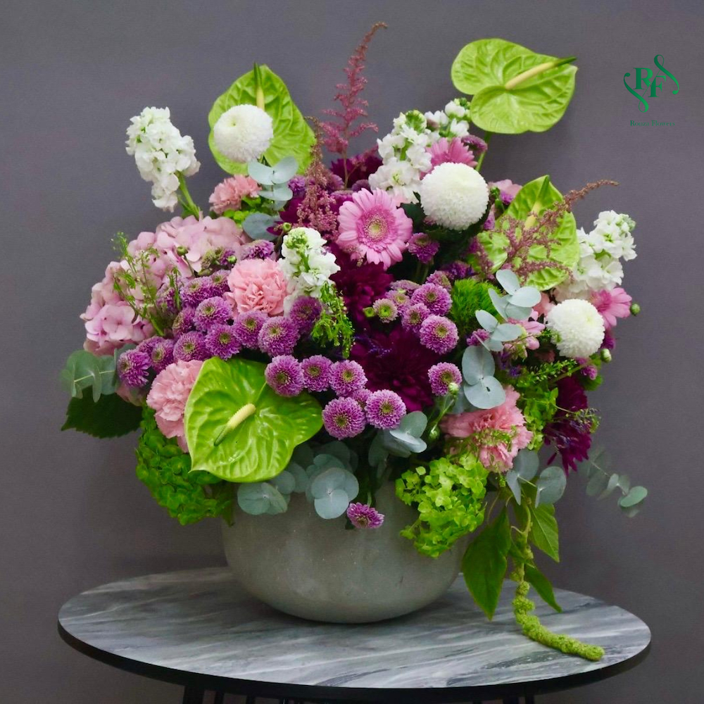 A ceramic vase luxury flowers arrangement includes , anthurium, Amarthus ,gerbera, chrysanthemum, mathola and greens