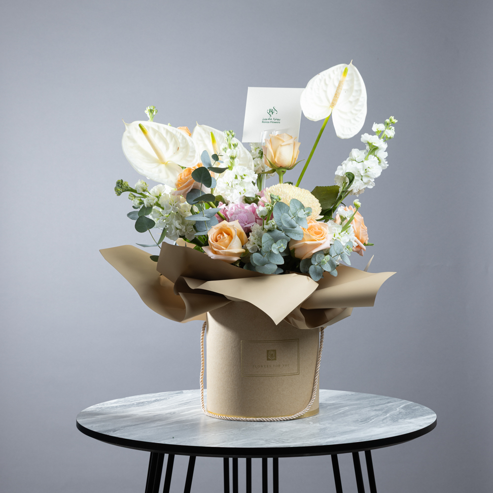 Flower arrangements of white anthurium, peach rose, white mithola, pink hydrangea and eculyptus in a brown box.