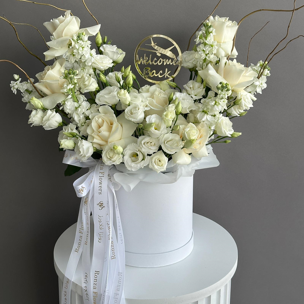 An elegant white floral arrangement designed to express purity, grace, and refined luxury. Featuring a harmonious blend of premium white roses and delicate lisianthus, accented with soft seasonal blooms and artistic golden branches. Arranged in a sleek white hat box, this timeless piece is perfect for welcoming gestures, special occasions, corporate gifting, or creating a serene statement in any space.