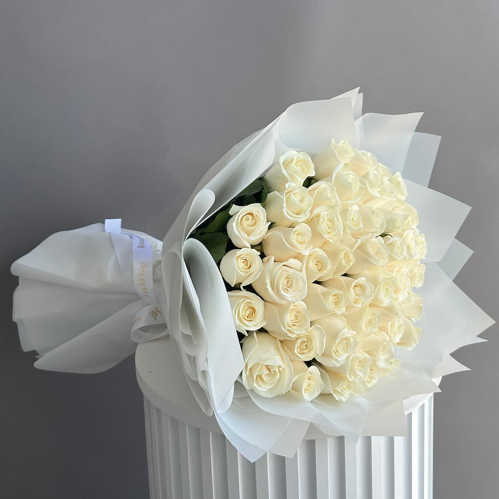 A hand bouquet that contains 50 white roses, arranged beautifully.