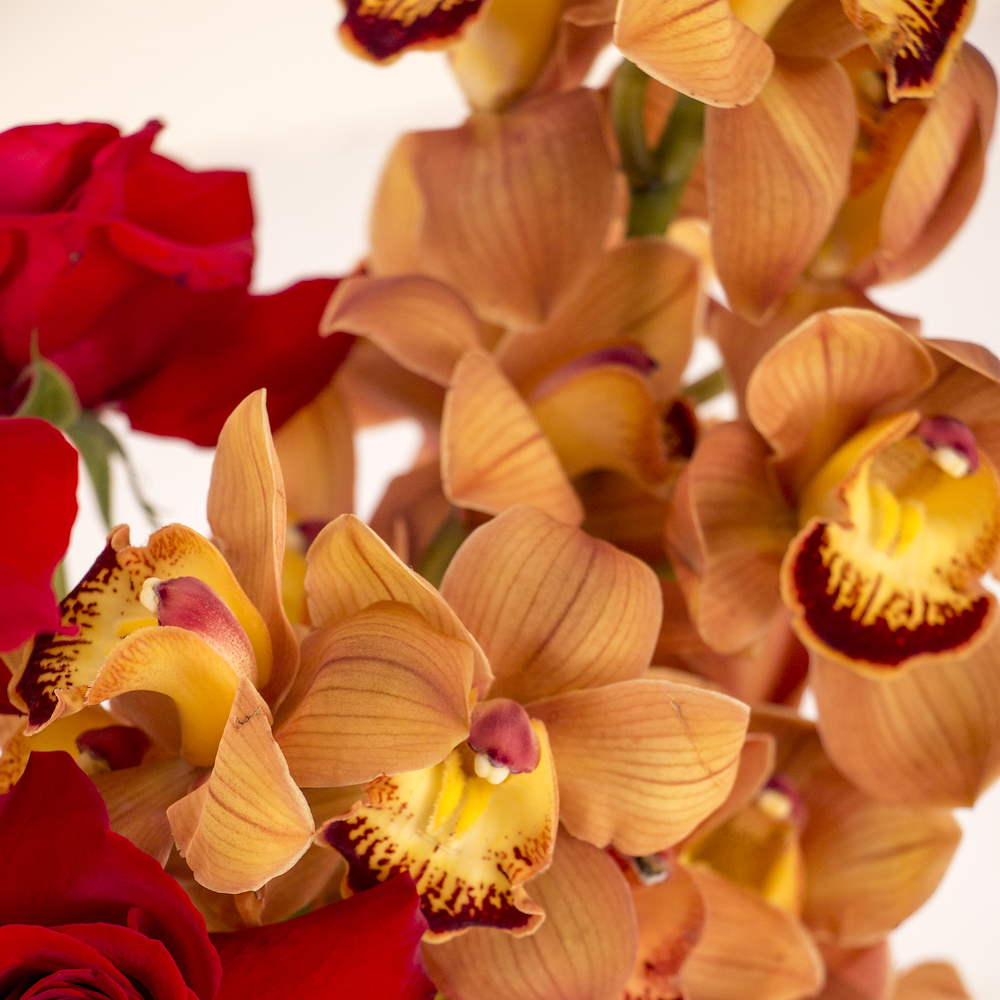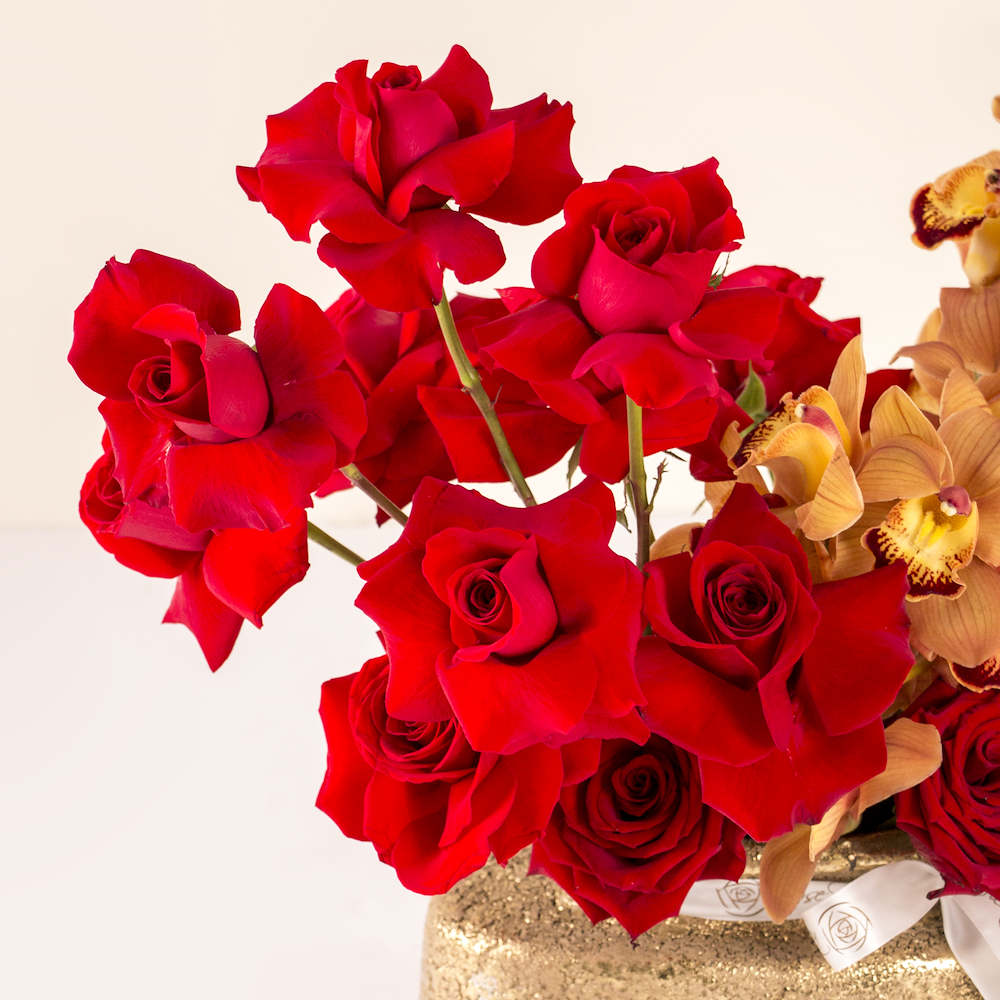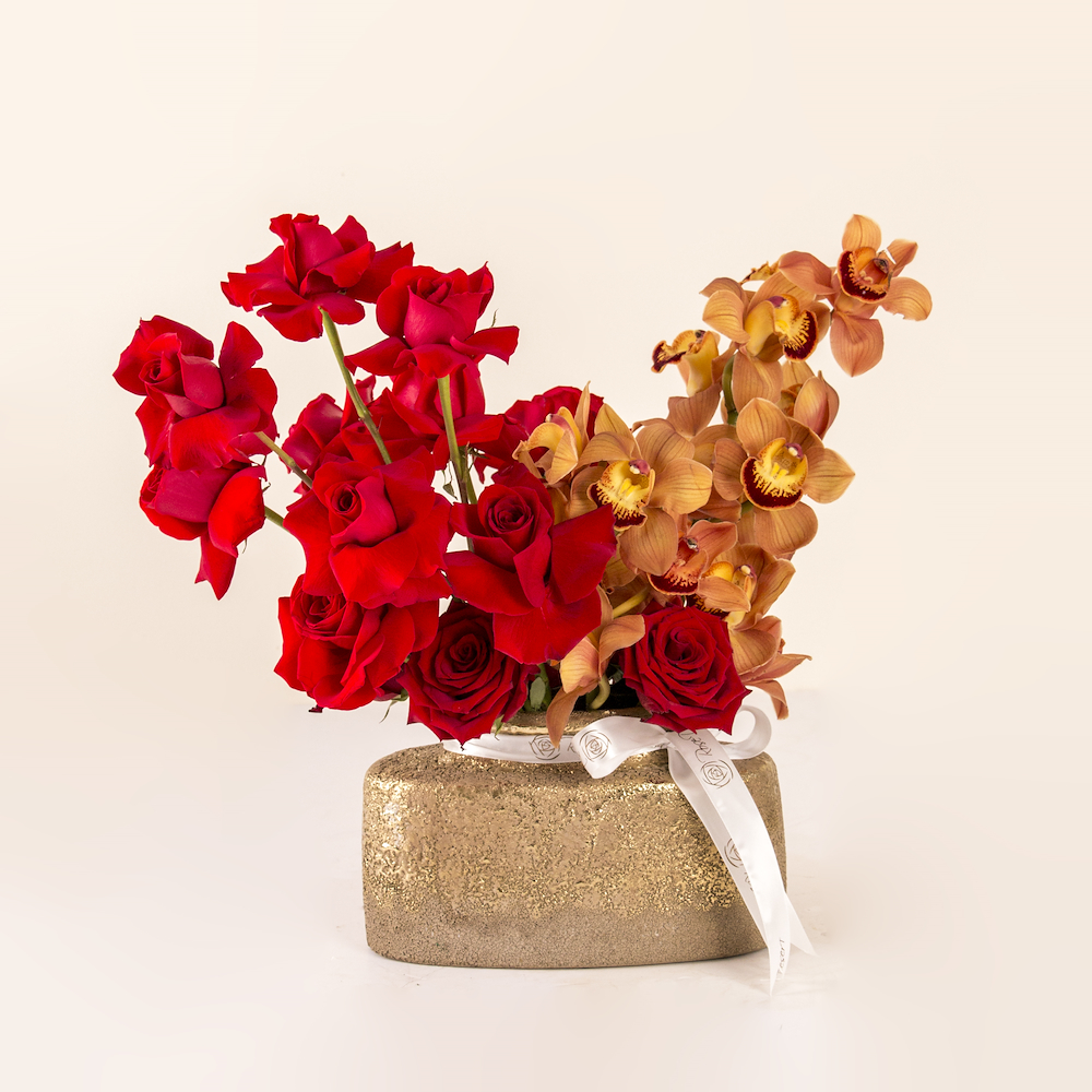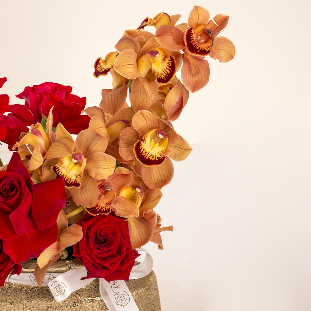 A bold, modern design featuring deep red roses paired with exotic bronze cymbidium orchids. Set in a textured gold-glittered oval vase with a signature ribbon, this striking contrast of colors offers a touch of pure luxury.