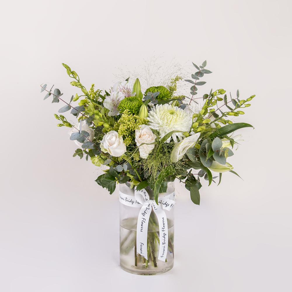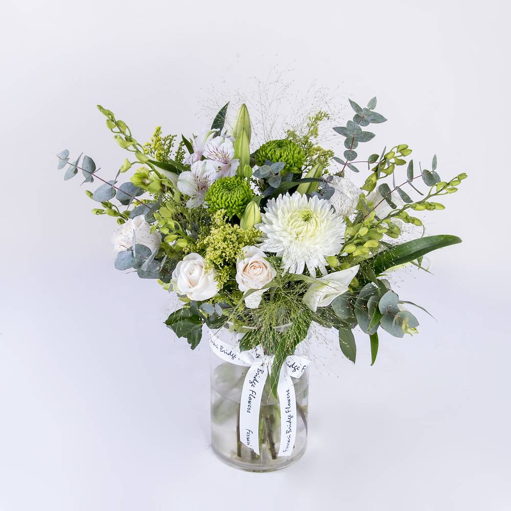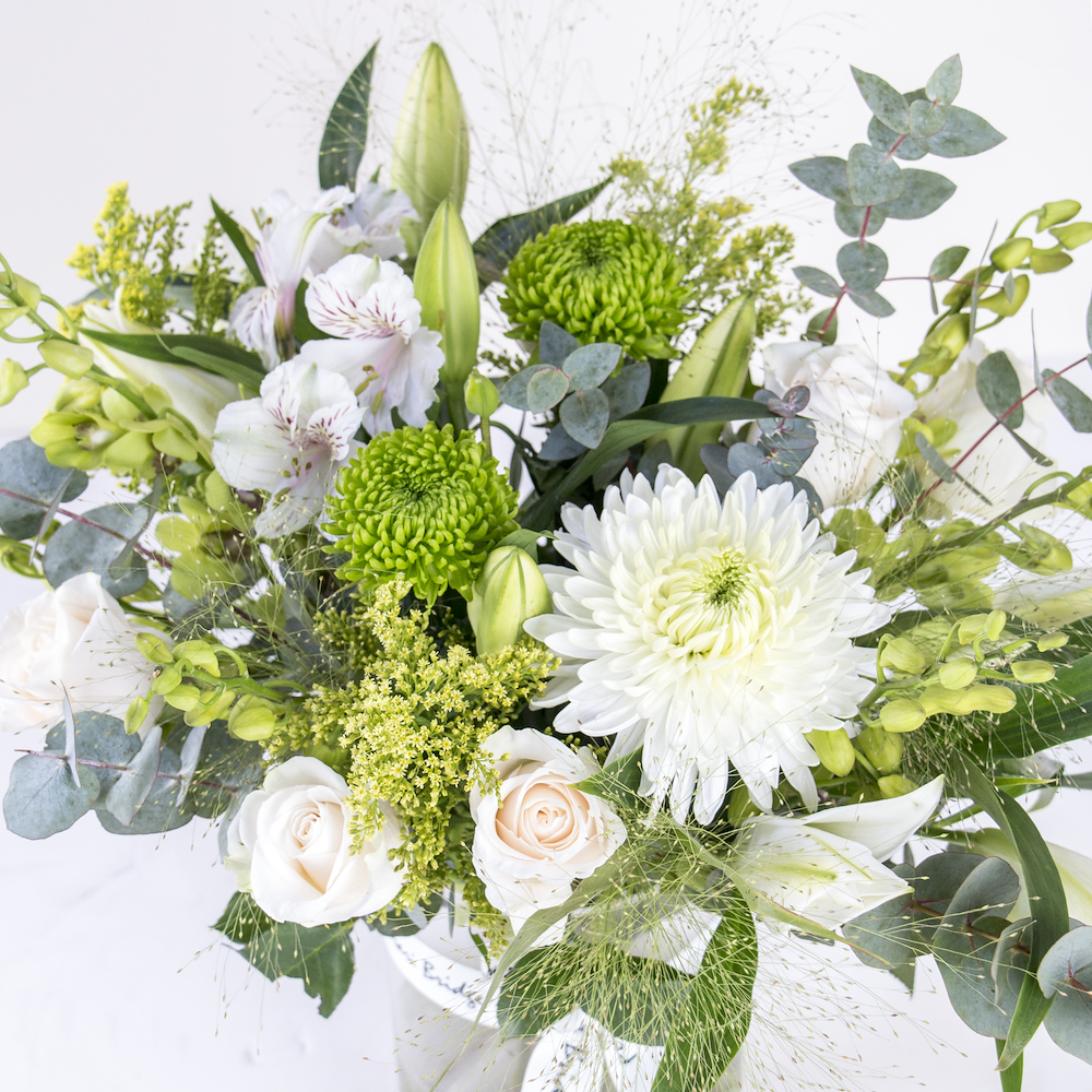 A refreshing and airy arrangement featuring crisp white roses, lime-green chrysanthemums, and elegant white lilies. Presented in a classic clear glass vase with a signature white ribbon, this lush mix of greens and whites brings a serene, natural feel to any interior.
