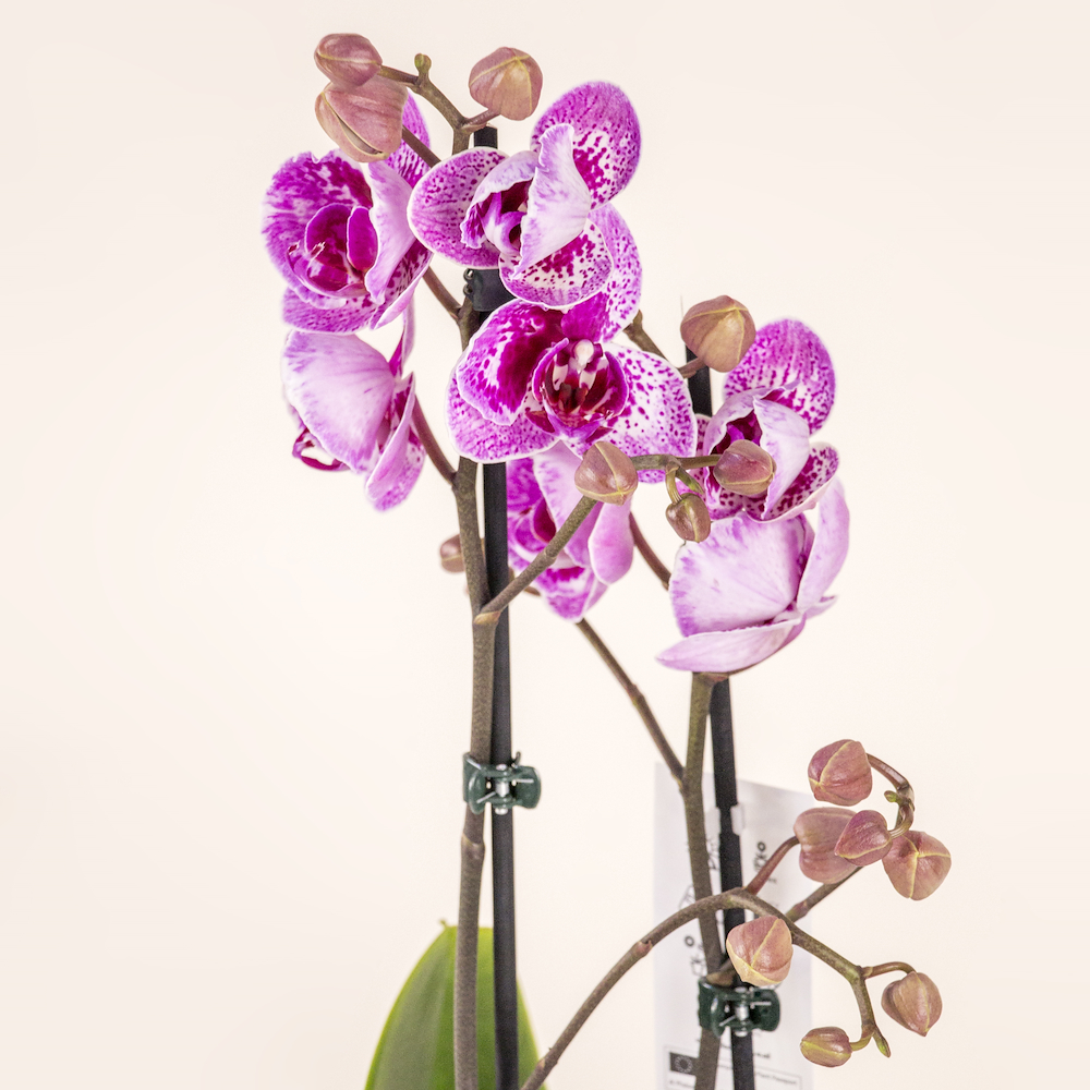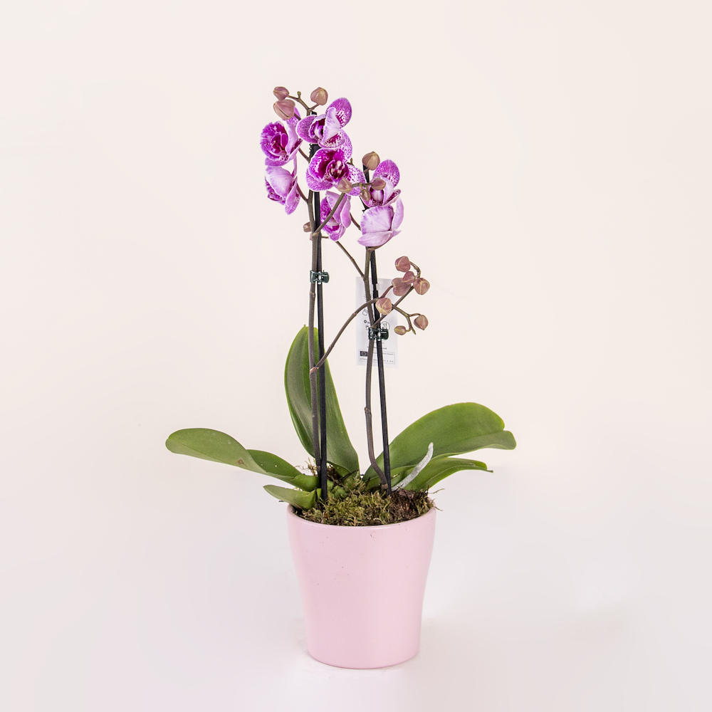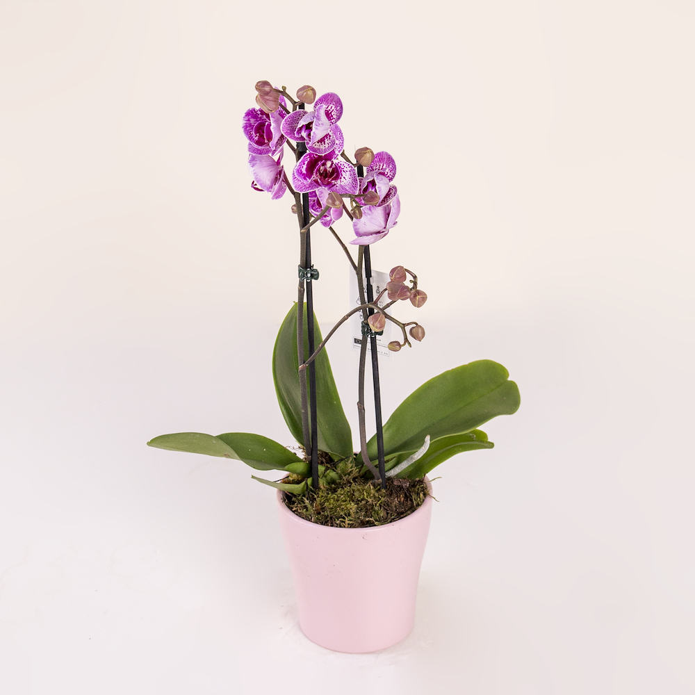 A stunning double-stemmed orchid plant featuring vibrant purple-speckled blooms. Presented in a stylish blush pink ceramic pot, this elegant, low-maintenance plant adds a touch of long-lasting natural beauty to any indoor space.