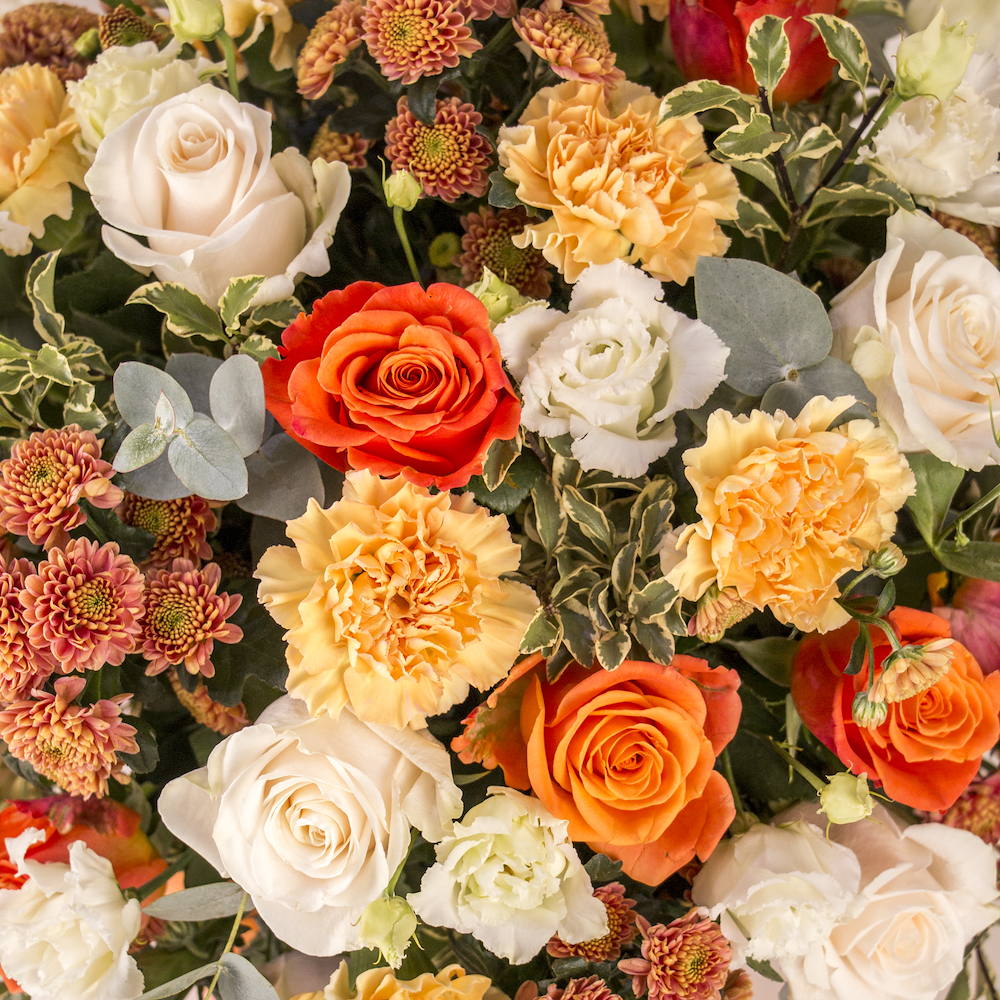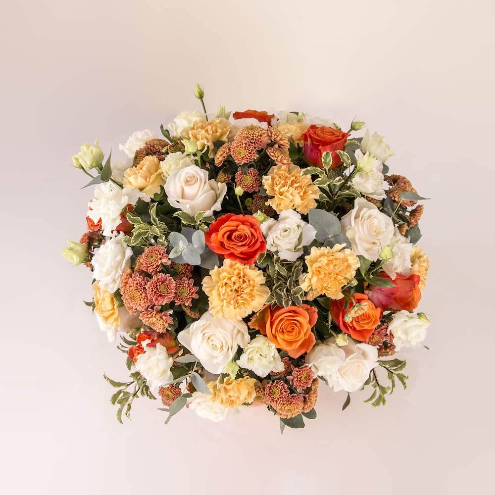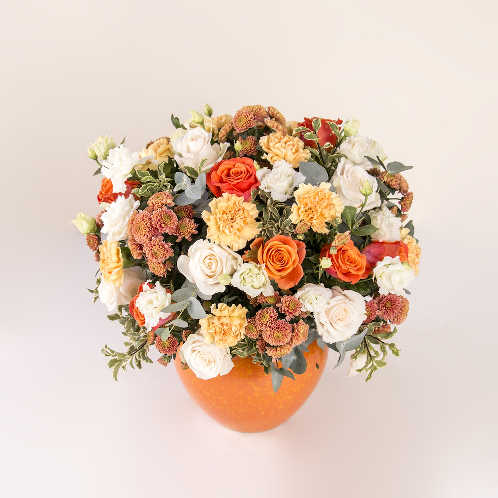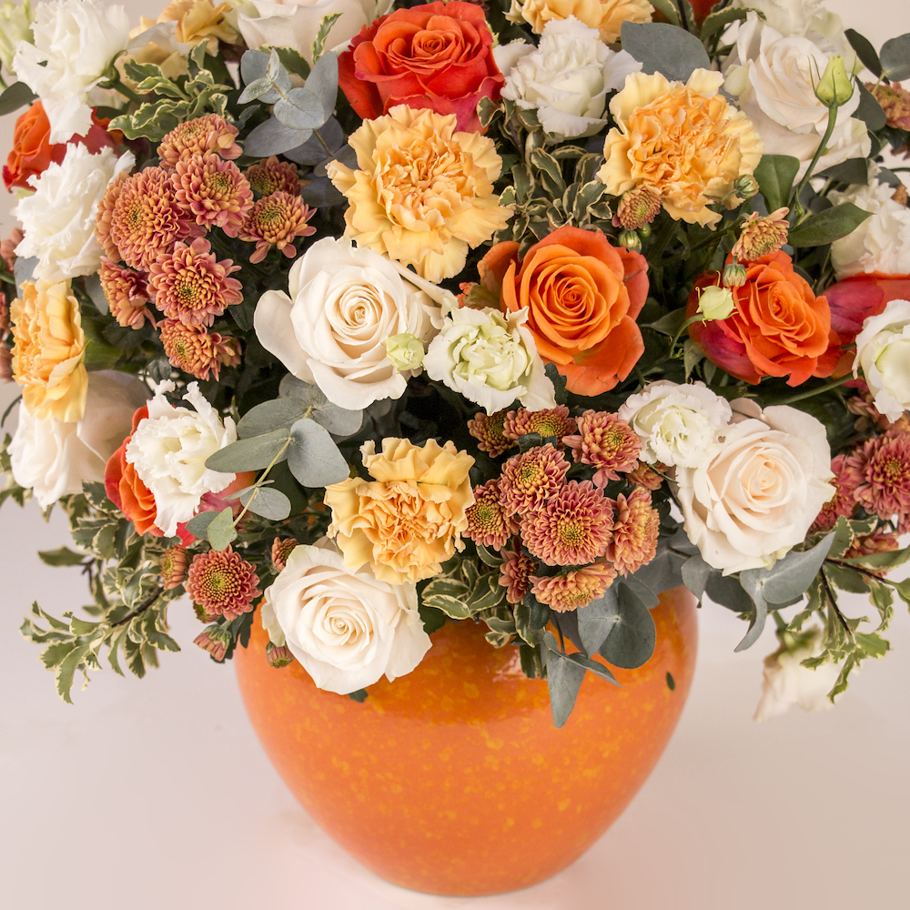 A cheerful and vibrant mix of orange roses, peach carnations, pink chrysanthemums, and creamy white baby roses, nestled in lush eucalyptus greenery. This full, rounded arrangement is presented in a bright tangerine-orange ceramic vase, bringing a sun-kissed, high-energy feel to any space.