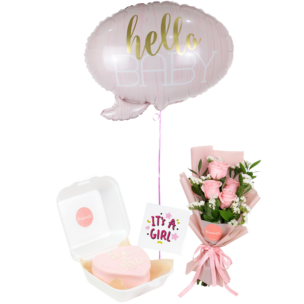A charming gift set featuring roses flower bouquet, a balloon and a mini cake.