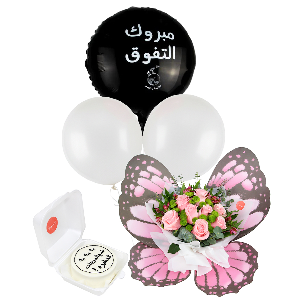 A sleek celebration set featuring a mini cake, a bouquet of pink roses and green chrysanthemums, and black-and-white balloons.