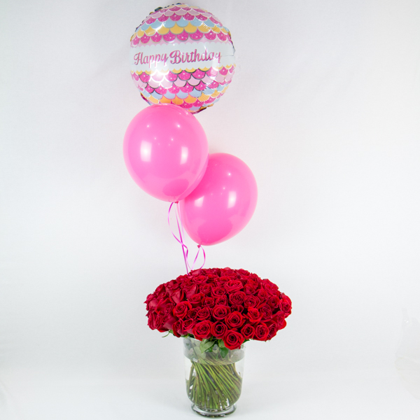 This arrangement contains red roses in a vase with birthday balloons.
