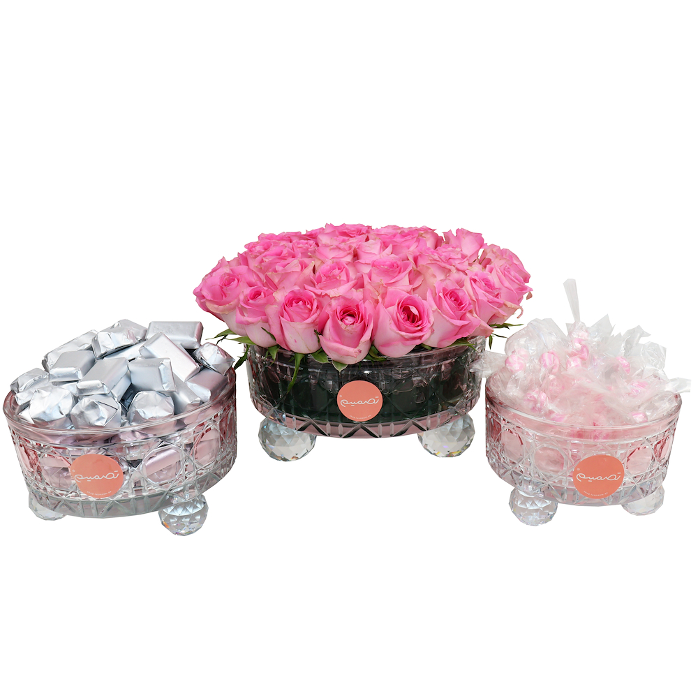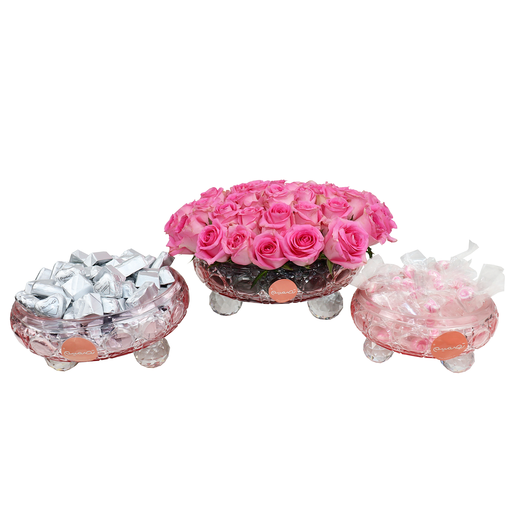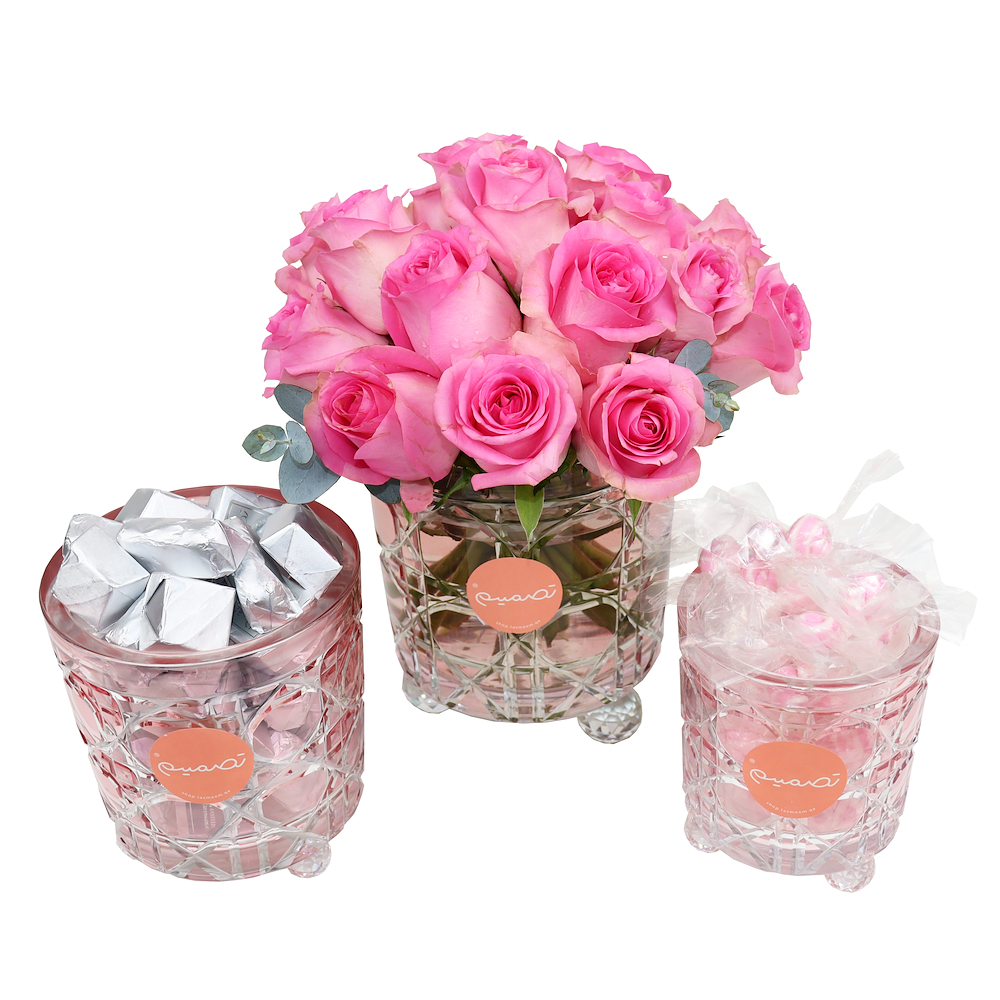 Elegant gift set featuring a grand arrangement of red roses in a bucket with ribbon detail, paired with a round tray holding of approx 600grams golden wrapped chocolates, topped with a floral arrangement for a luxurious touch.