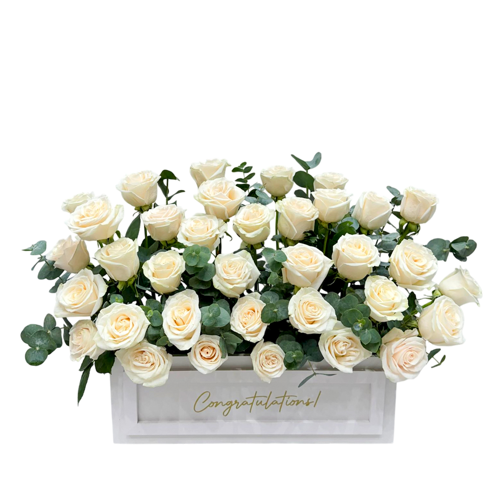 A box featuring white roses in a sleek box, perfect for congratulating someone in style or brightening their special day.