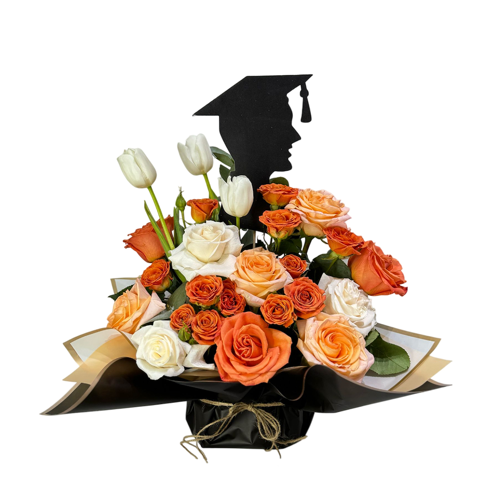 A bouquet featuring roses, baby roses and tulips.
