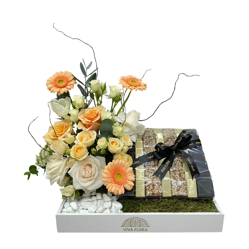 A premium tray featuring roses, gerbera and gypsophila flowers paired with 800g of rich assorted chocolates.