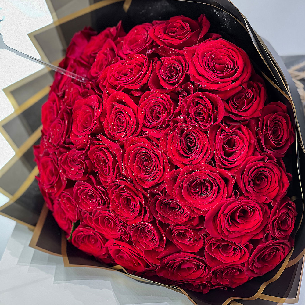 A stunning bouquet of 50 vibrant red roses elegantly presented in classic black wrapping paper, making every occasion memorable.