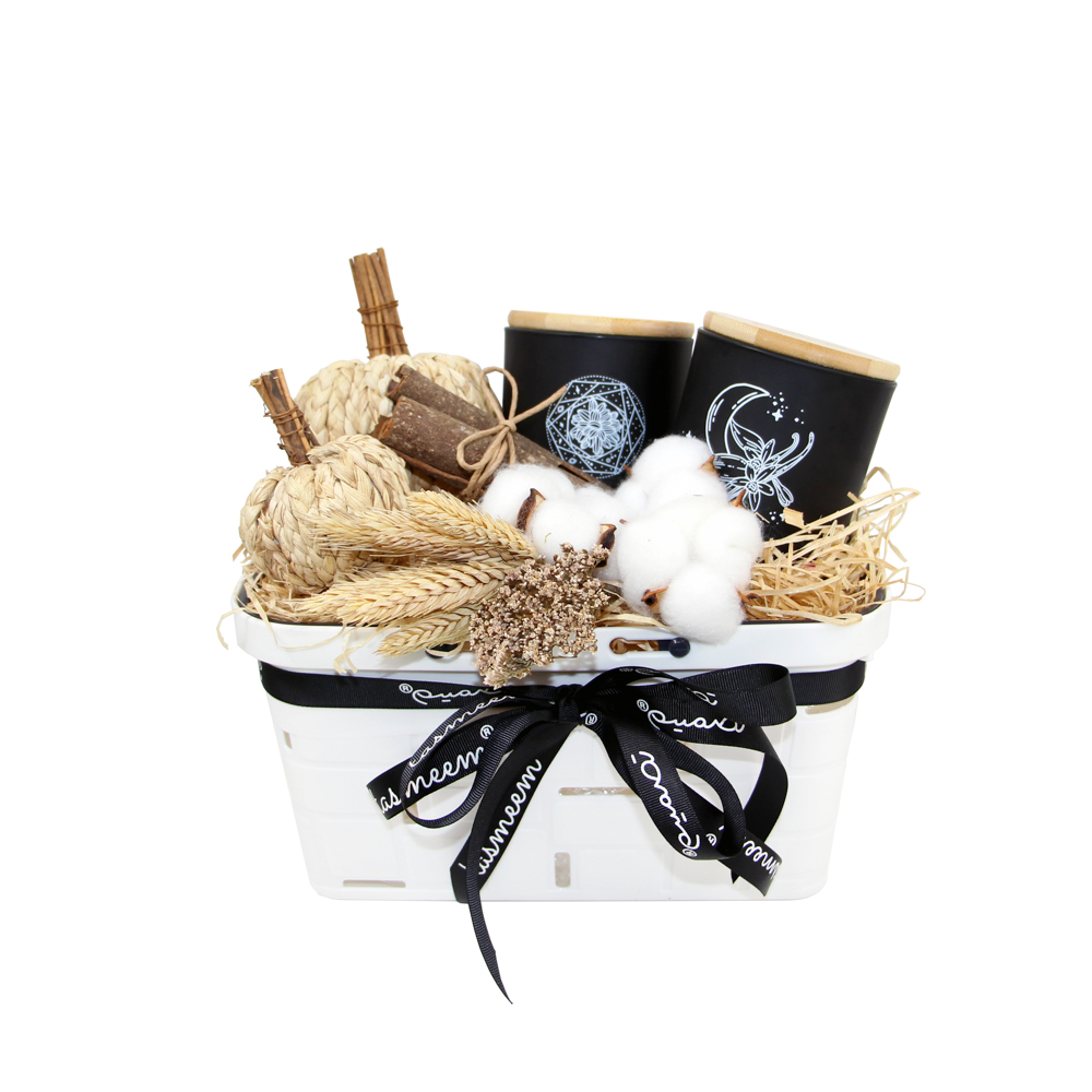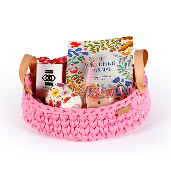 A basket that contains a wellbeing journal, greeting card, pen, an espresso cup and small candle and a sparkly candle. Note: colors of basket, pen and espresso cup may vary.