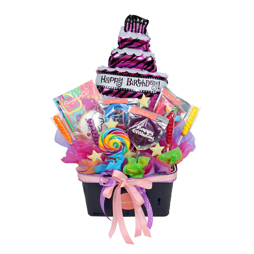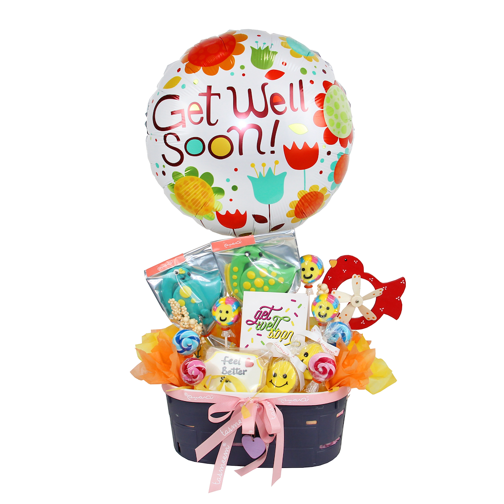 A vibrant get-well gift basket filled with lollipops and cookies treats, colorful balloons, get well cards and cheerful decorations designed to spread joy and celebration on someone’s special day.