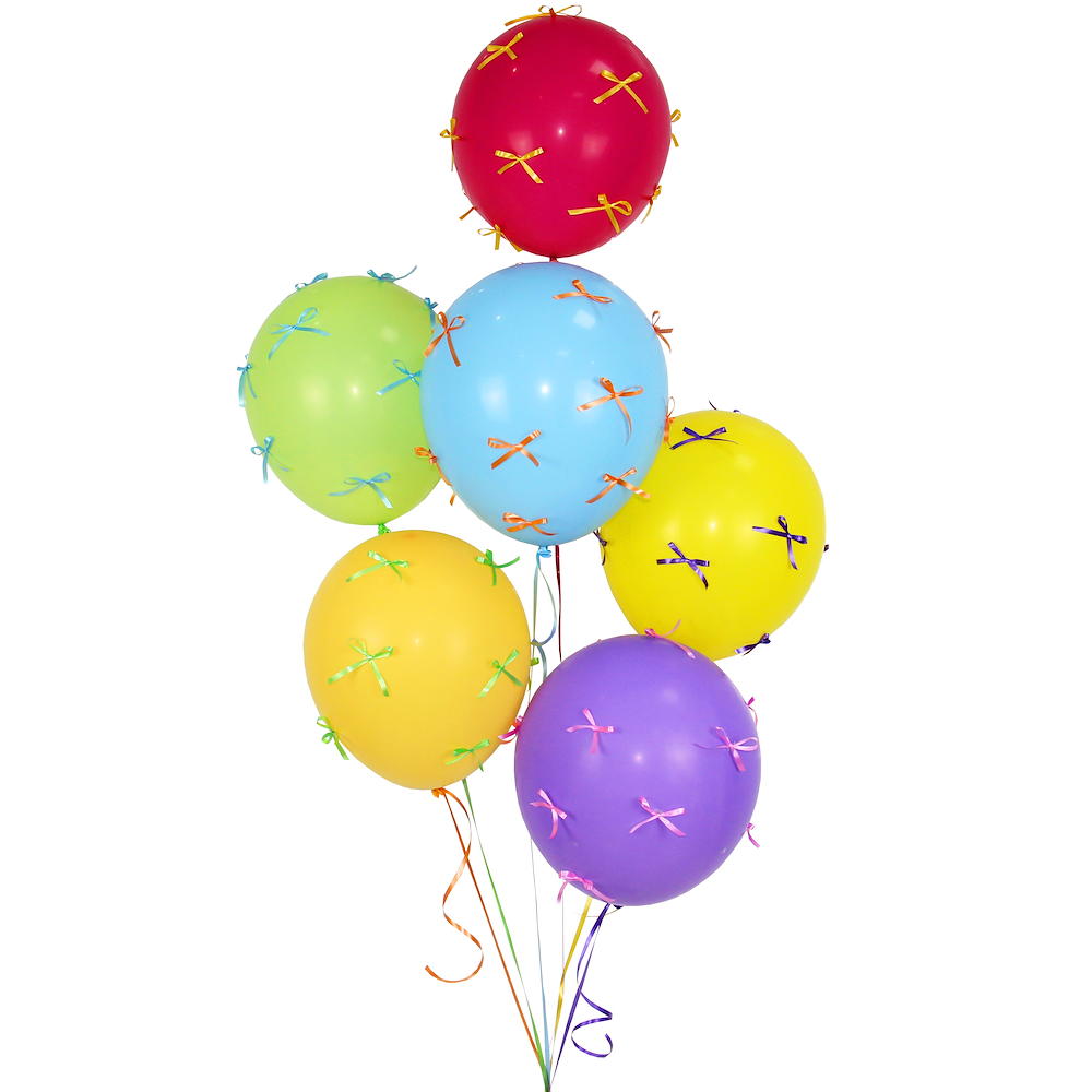 A vibrant cluster of six colorful balloons, red, blue, green, yellow, and purple each adorned with delicate ribbon bows.