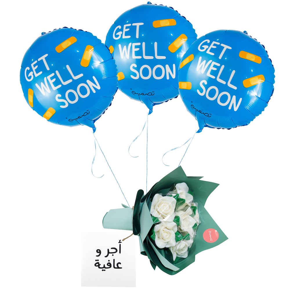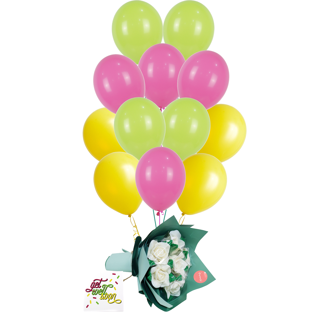 A delightful mix of sweetness and care, featuring a balloon, card, and rose lollipop bouquet to bring joy and encouragement.