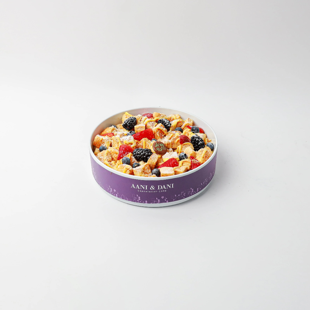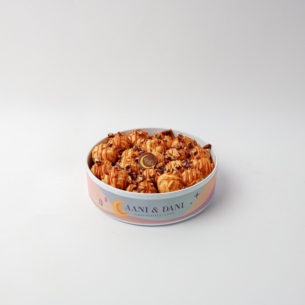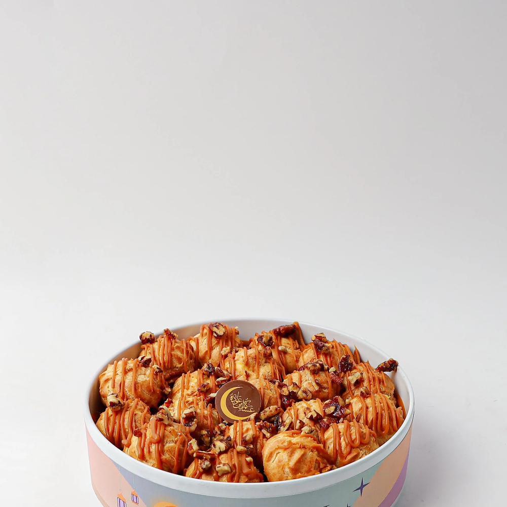A choux pastry balls featuring French choux pastry, filled with creamy cheese, decorated with caramel, and topped with a chocolate logo.
