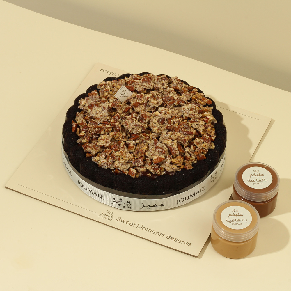 A rich dark chocolate cake filled with smooth chocolate mousse, topped with a generous layer of salted caramel, and carefully toasted caramelized pecans.