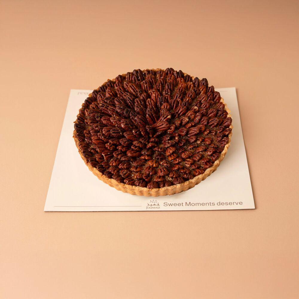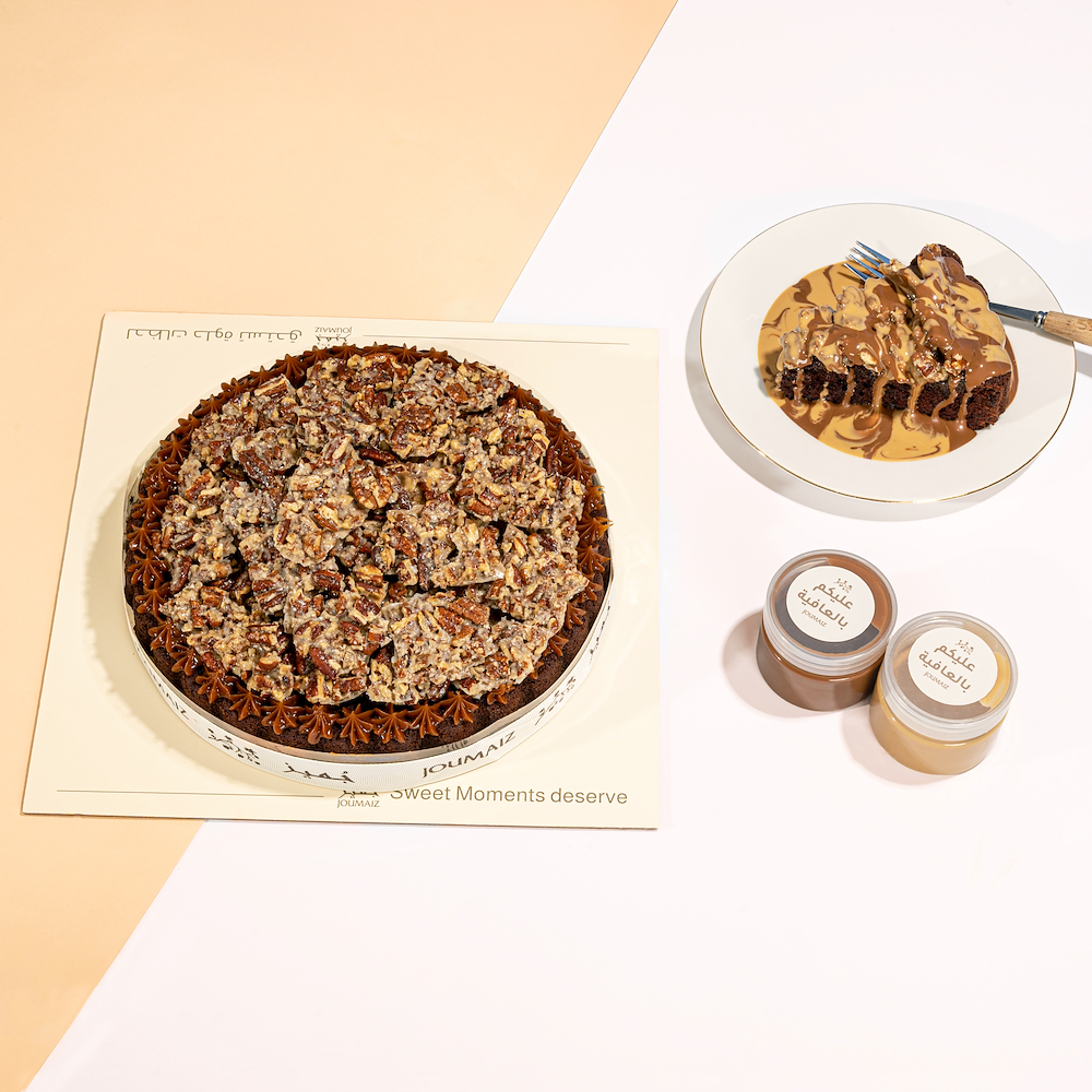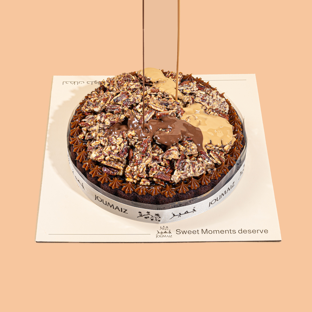 Indulge in a decadent experience with a rich dark chocolate cake filled with smooth chocolate mousse, topped with a generous layer of salted caramel, and carefully toasted caramelized pecans. And best of all? Served with milk chocolate sauce and Belgian chocolate caramel sauce. Text available (Arabic/English). Please enter only what you need. Serves 8-9 people.