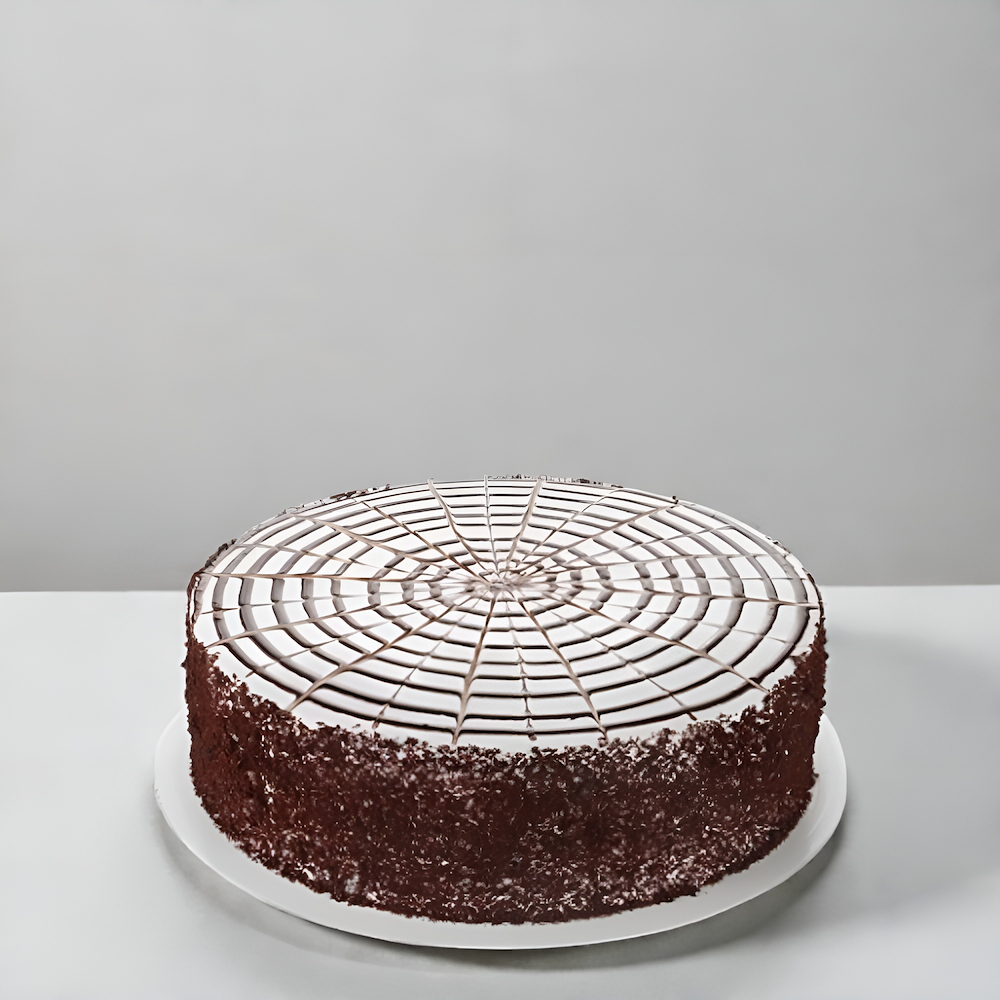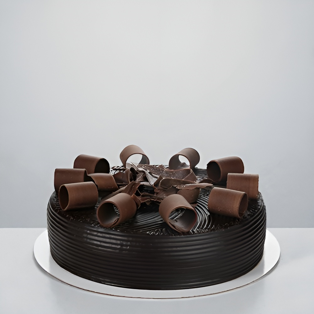 A three layer brown sponge cake featuring an almond, chocolate, and caramel filling, plus a peanut butter cream, chocolate, and caramel filling.
