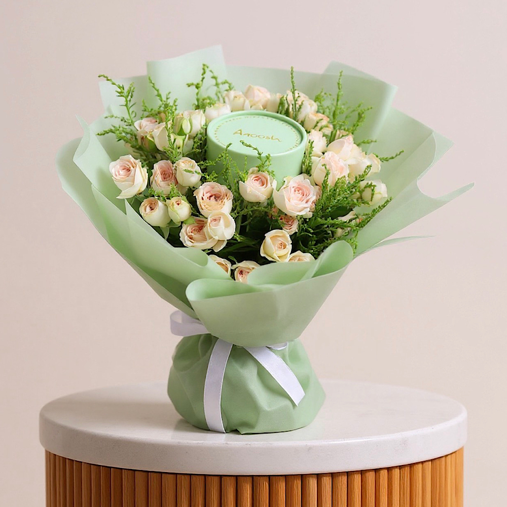 An elegant bouquet featuring baby roses and Anoosh chocolates.