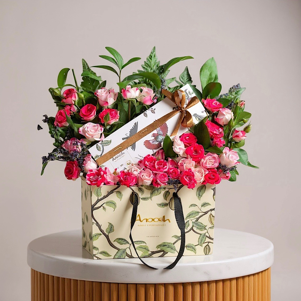A luxurious bouquet featuring baby roses with Anoosh chocolates.