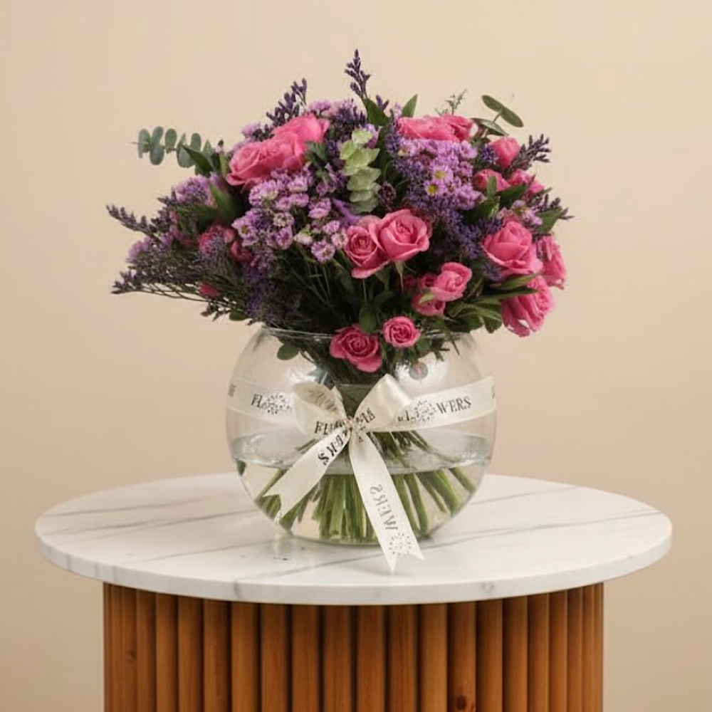 An elegant vase containing a bouquet of natural roses in harmonious colors of pink and mauve adds a wonderful aesthetic touch to your home or office.