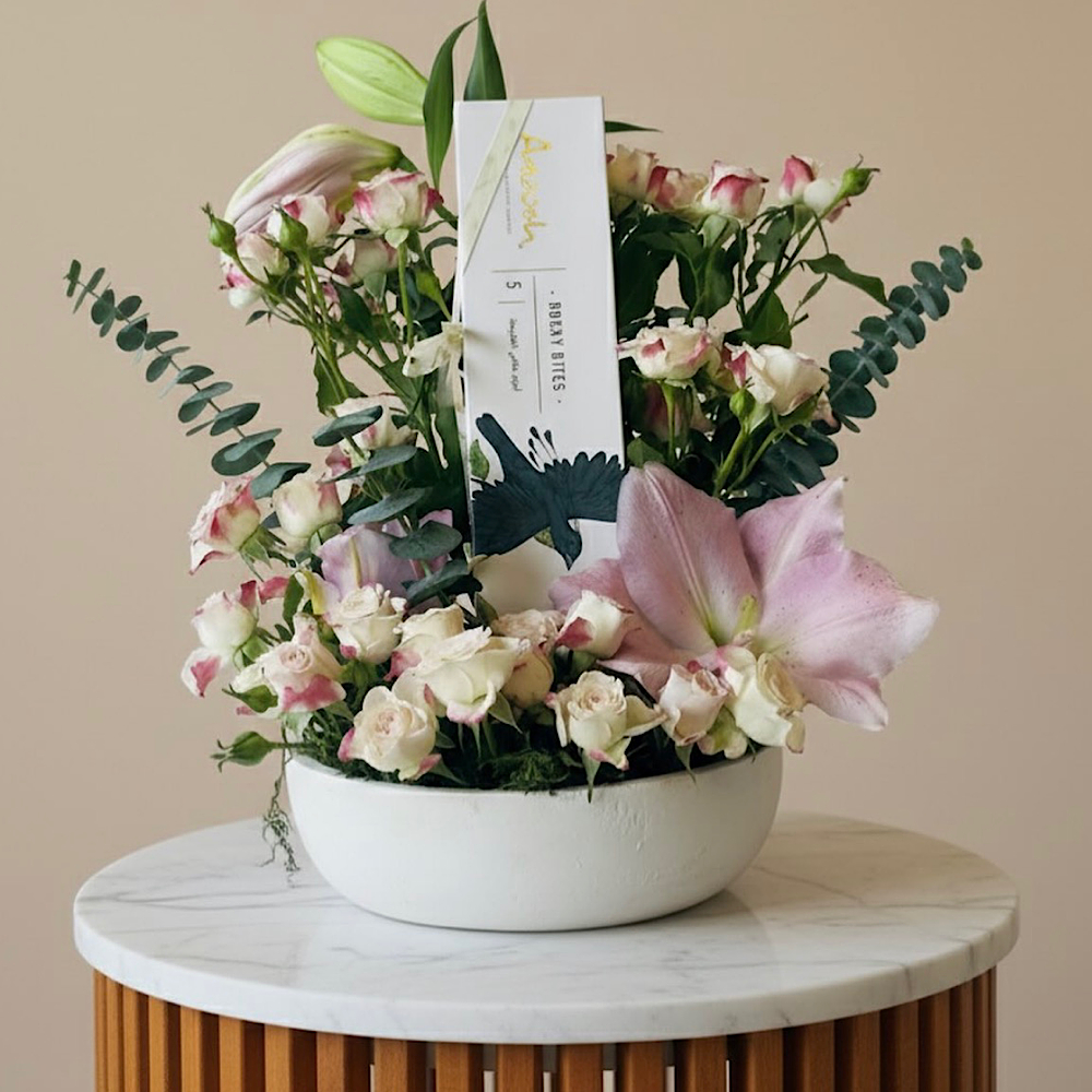 Natural roses and lilies in attractive pink colors that comes with luxurious Anoush chocolate pieces. A perfect gift for happy occasions.