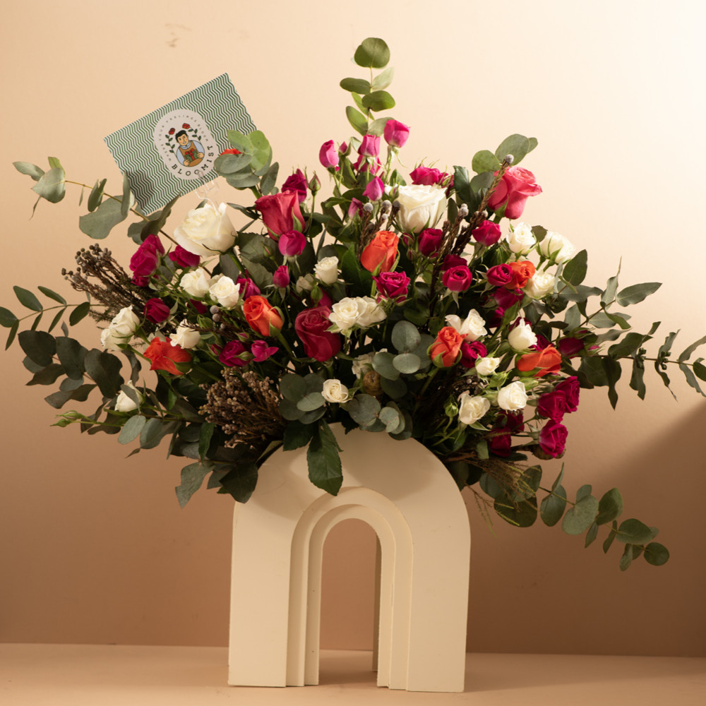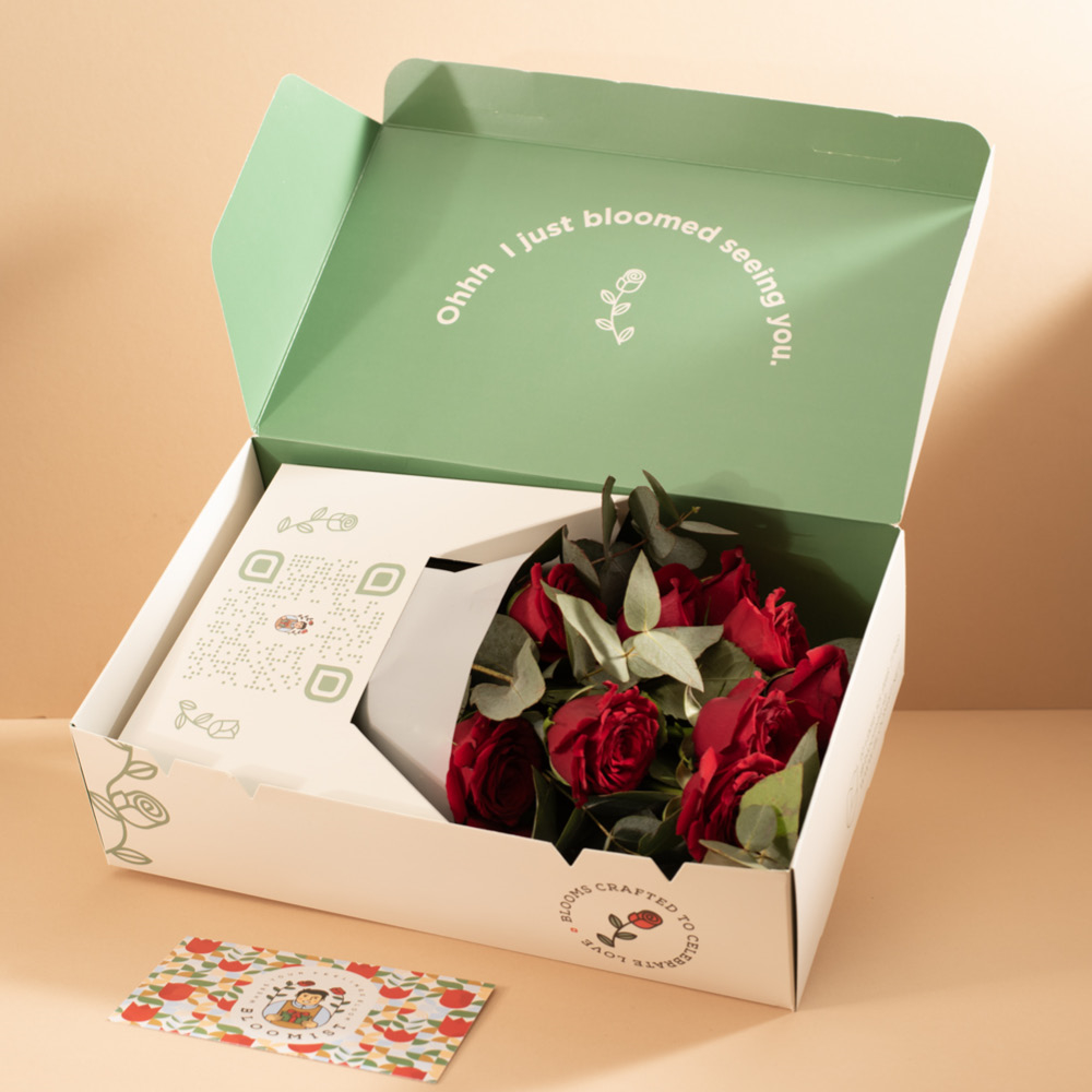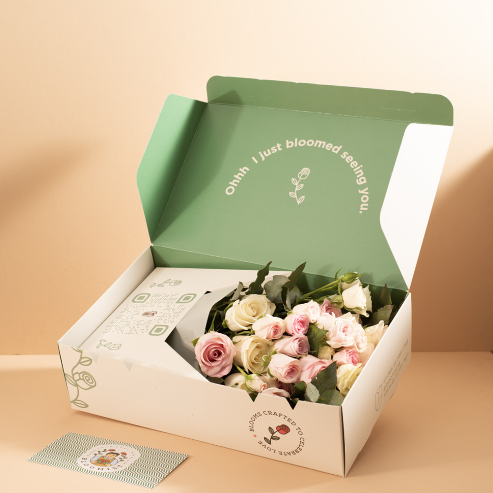 A box filled with roses, baby orchid and casablanca flowers with greens.